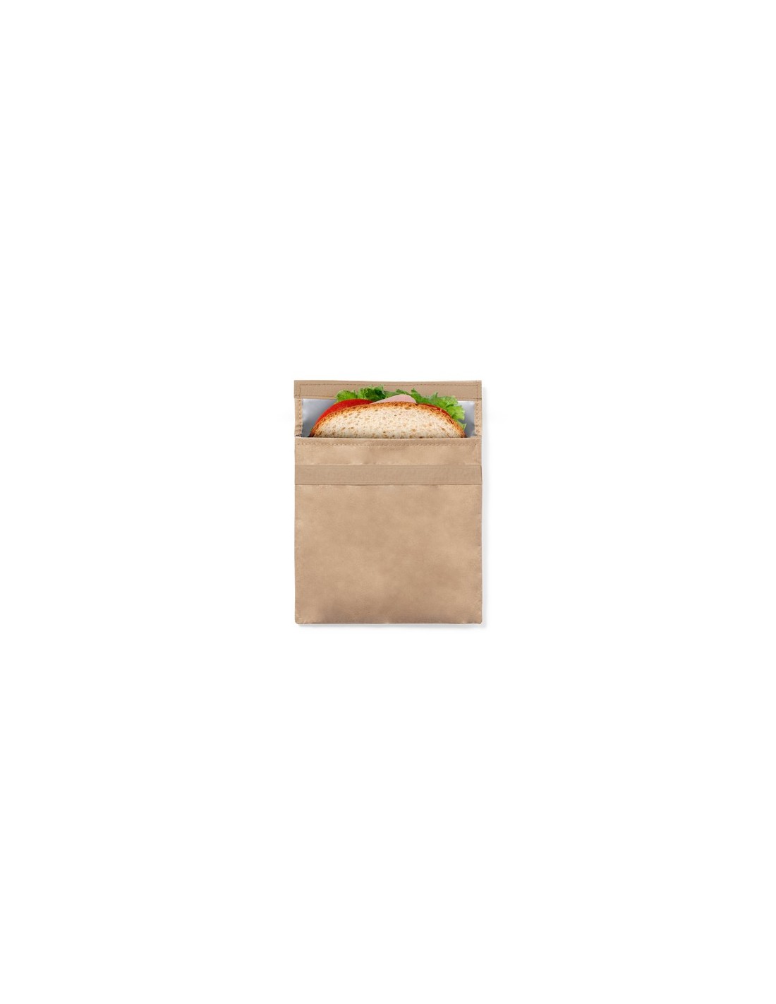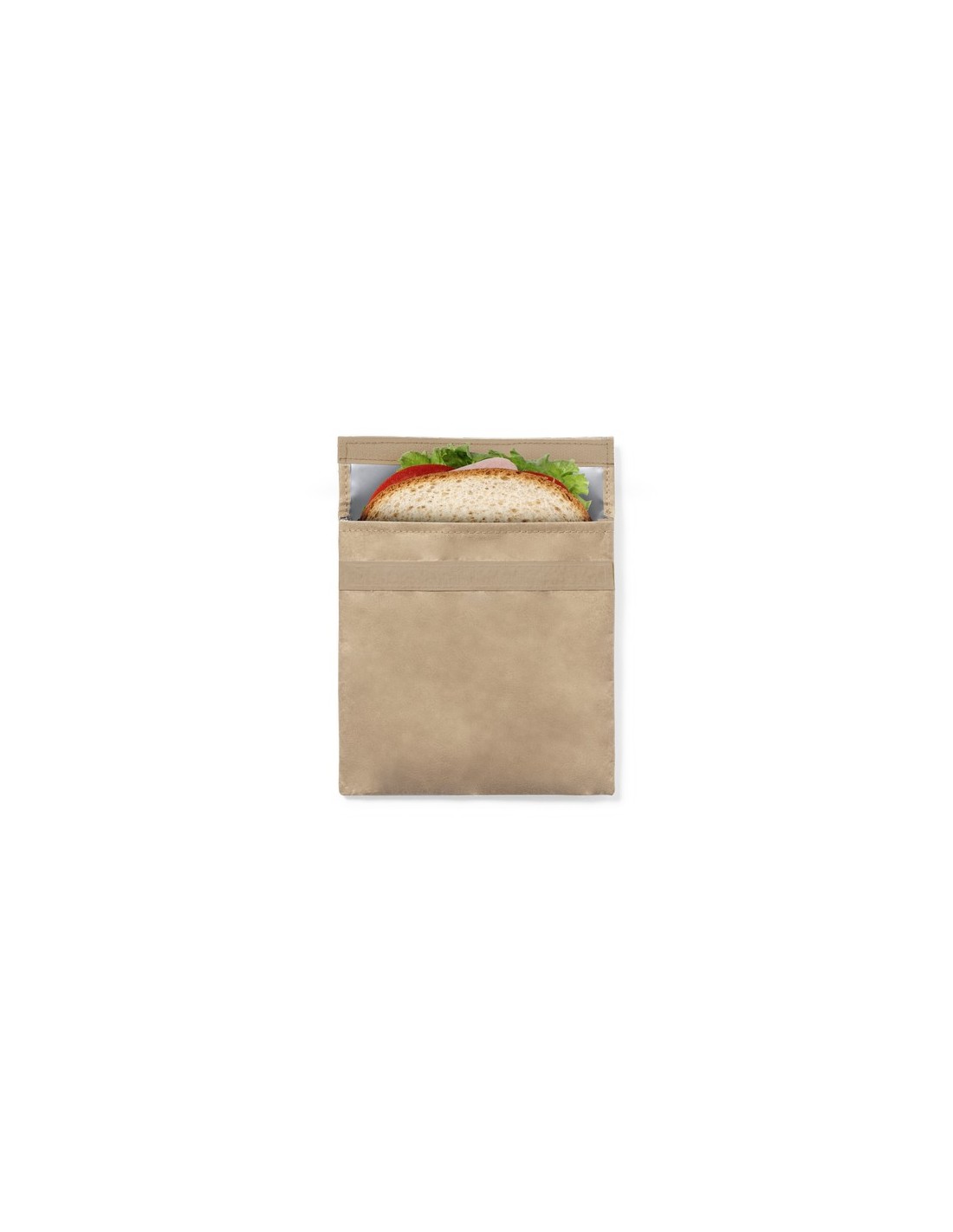 Portasnacks térmico de línea nature. Exterior fabricado en resistente papel reciclado laminado, e interior isotermo en PEVA. Con cierre de velcro. Composition : Papel Reciclado Laminado/ PEVA.