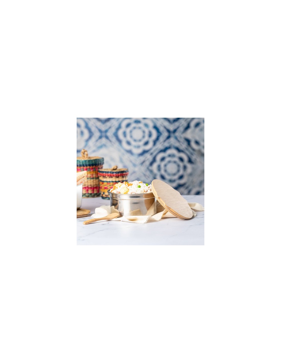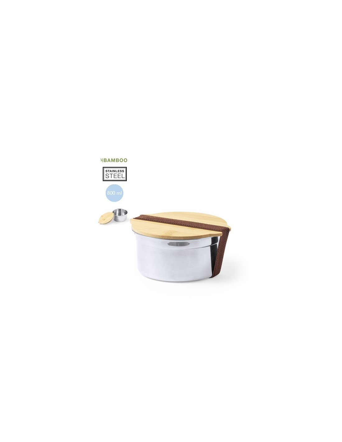 Fiambrera de 800 ml de capacidad fabricada en acero inox. Con tapa hermética en bambú y cinta elástica de cierre. Presentada en caja individual de diseño. 800 ml Composition : Acero Inox/ Bambú.