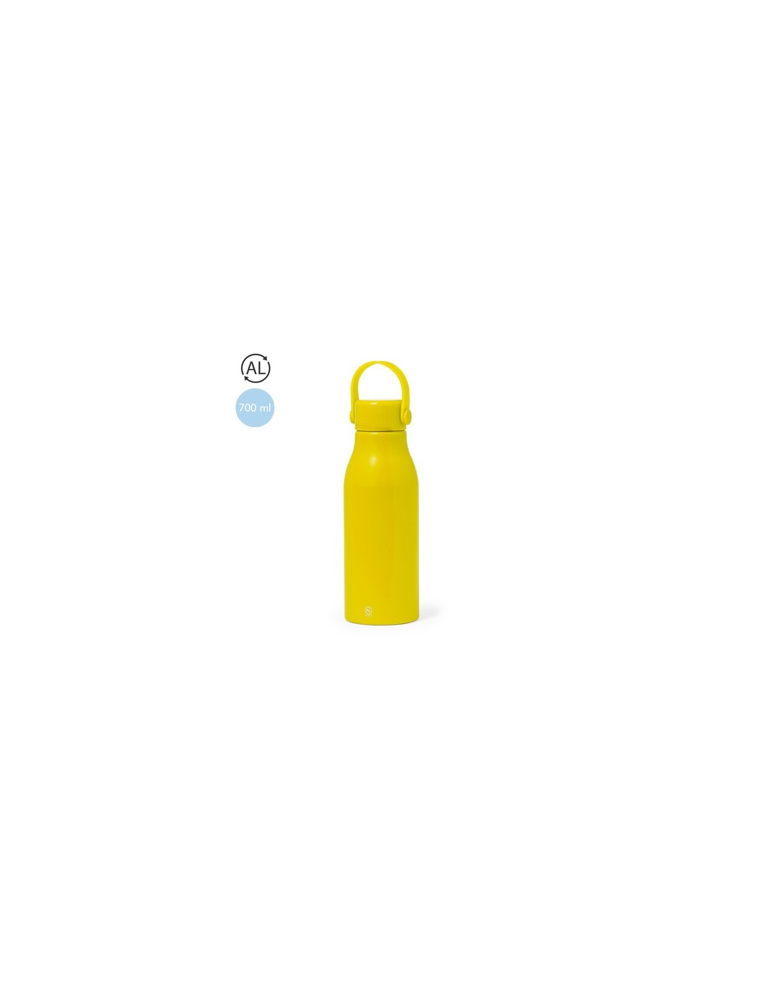 Bidón de 700 ml de capacidad. Fabricado en resistente y sostenible aluminio reciclado. Con tapón a rosca en mate y asa integrada a juego para un sencillo transporte. Cuerpo de acabado satinado. Disponible en variada gama de colores y libre de BPA. Incluye distintivo Aluminio Reciclado. Presentado en caja de diseño kraft y en bolsa individual reciclada.El aluminio reciclado es un material con posibilidades de reciclaje casi infinitas, sin perder sus propiedades originales y consumiendo menos energía en este proceso. 700 ml Composition : Aluminio Reciclado.