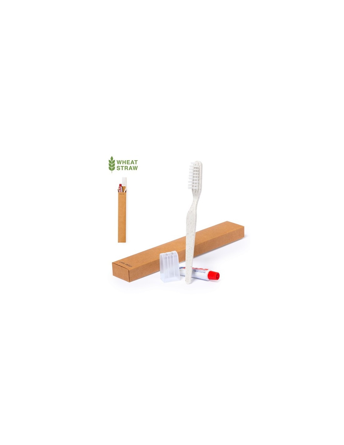 Set dental con cepillo de dientes y pasta dentífrica. Contenido:Cepillo de dientes fabricado en caña de trigo, para así fomentar la utilización de materias primas naturales y reducir las emisiones contaminantes.Pasta dentífrica en tubo de 6 gr, con tapón a rosca.Set presentado en estuche individual de cartón reciclado. Cepillo Dientes Caña de Trigo/ PP. Pasta Dentífrica 6 gr