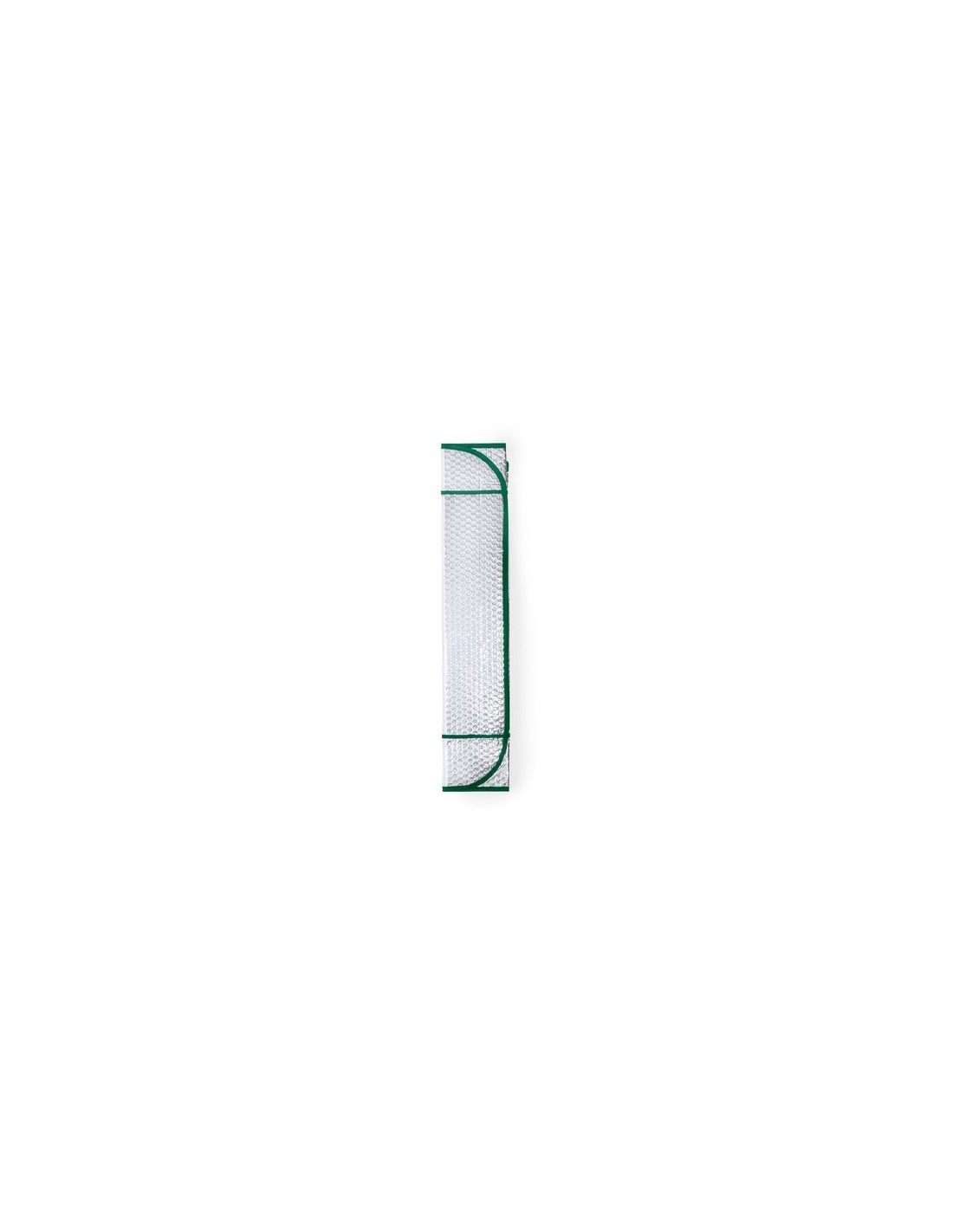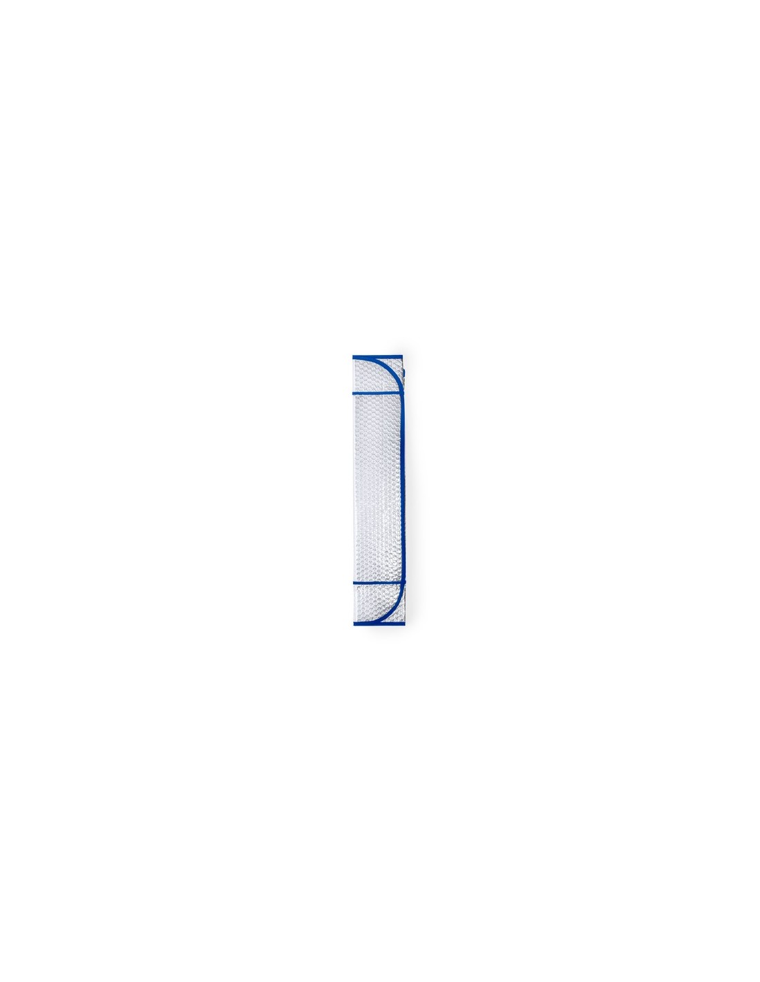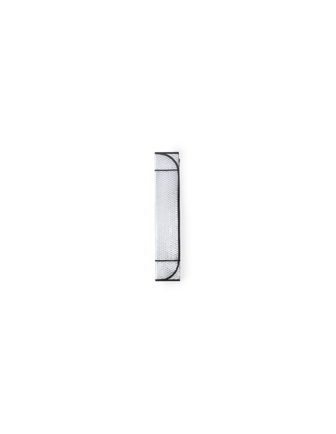 Parasol en aluminio con burbuja en ambas caras. Acabado plateado metalizado, con ribetes en color negro y en tamaño 130 x 70 cm. Con cintas elásticas para plegado y presentación desplegado en plancha para fácil impresión, con bolsas aparte. Composition : Aluminio Burbuja Dos Caras.