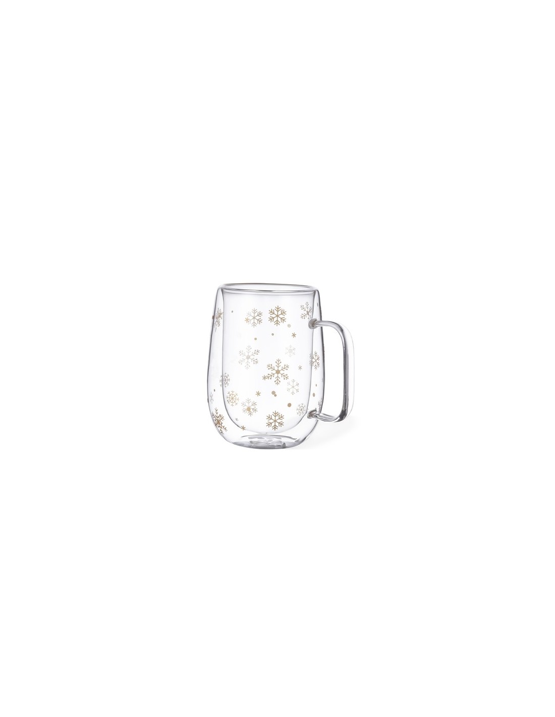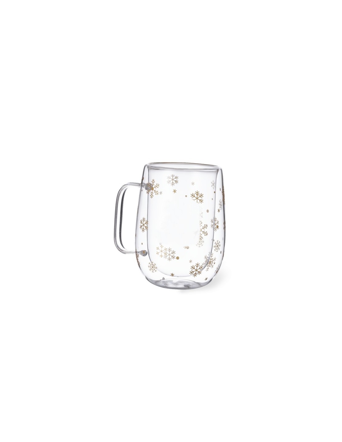 Taza térmica de doble pared y 400 ml de capacidad. Con original diseño de copos de nieve y área de marcaje especial en el frontal. Fabricada en cristal de borosilicato, que ofrece una resistencia y durabilidad excepcionales, alargando su vida útil y pudiendo ser reutilizada infinidad de veces.Presentada en caja de diseño en color negro con ilustración en color dorado. 400 ml Composition : Cristal Borosilicato.