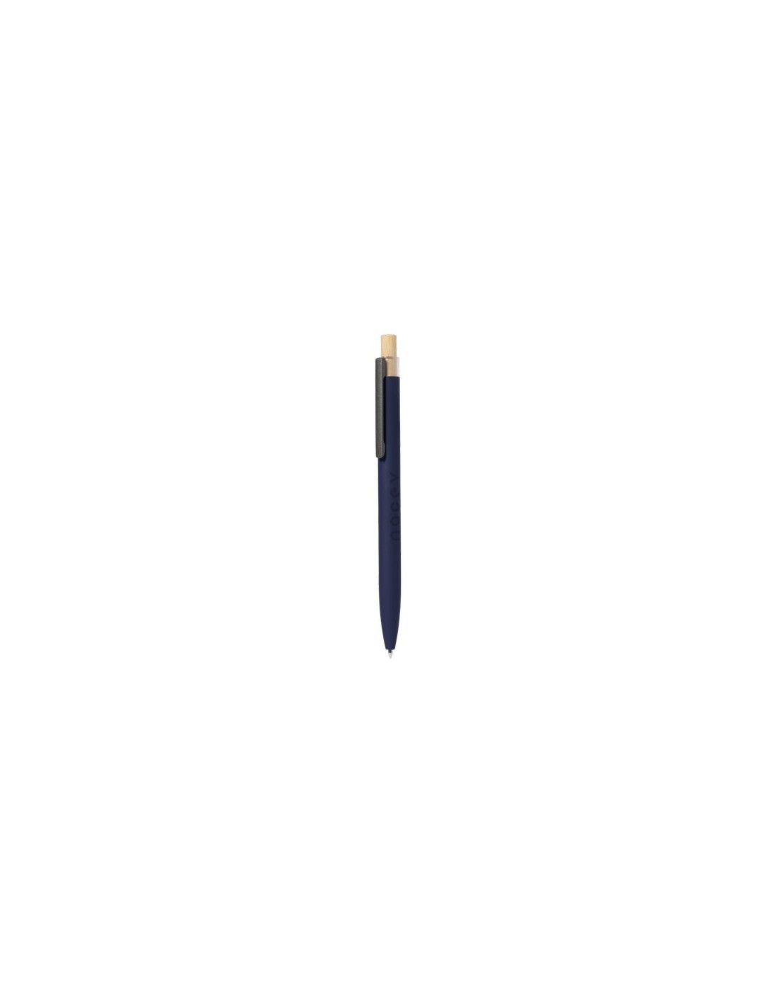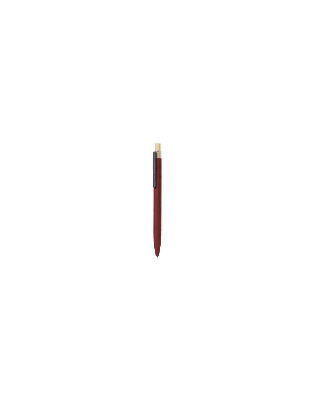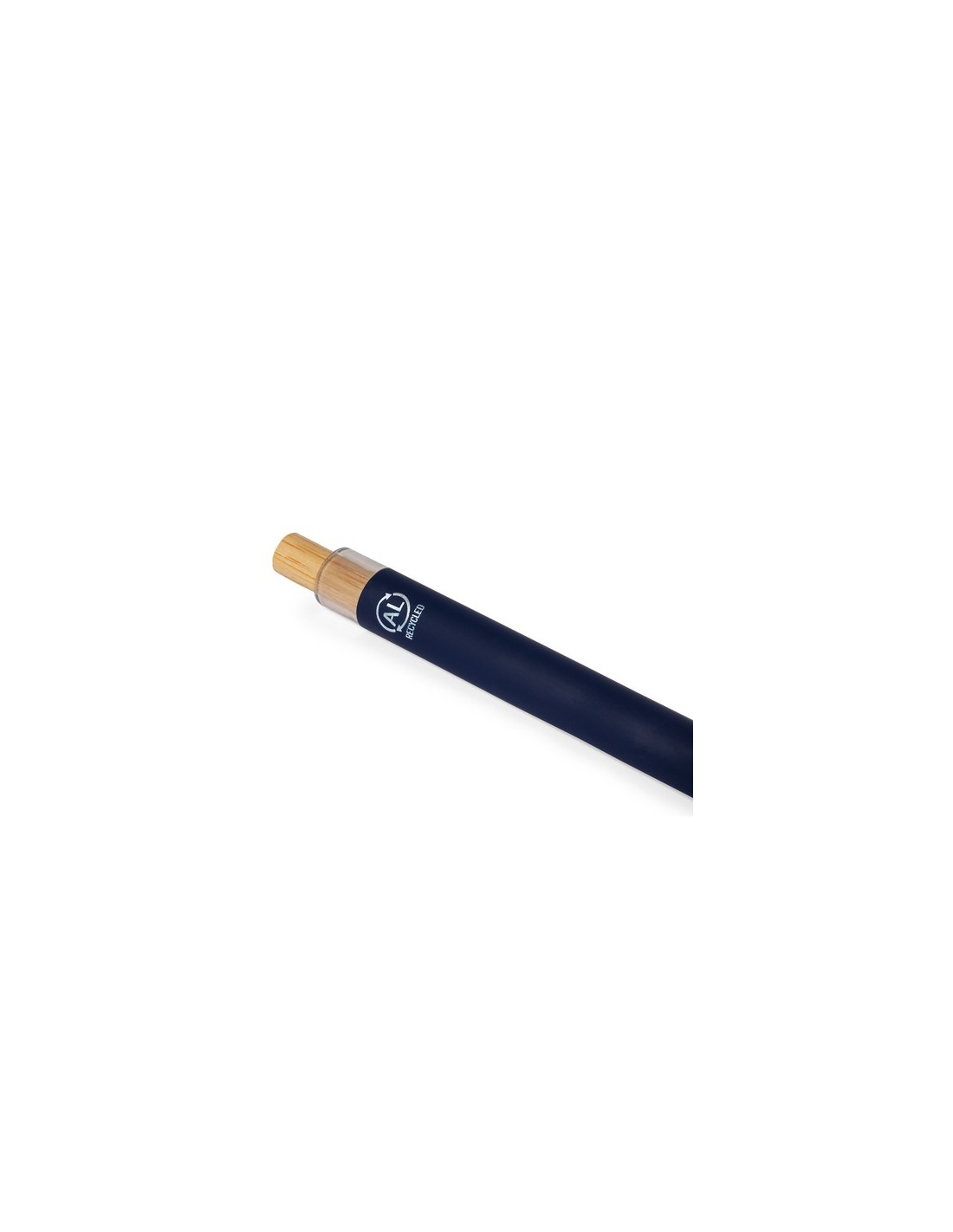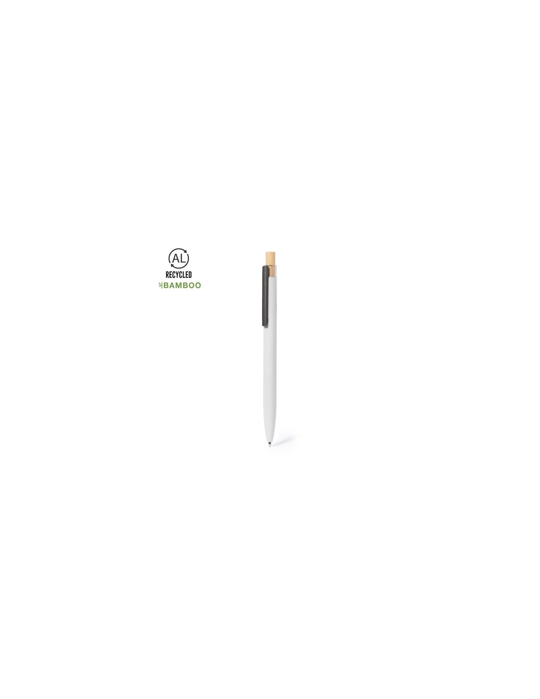 Bolígrafo de mecanismo pulsador fabricado en aluminio reciclado. Pulsador en bambú y cuerpo acabado goma, disponible en variada gama de elegantes colores. Clip metálico y distintivo aluminio reciclado en la parte superior del bolígrafo. De cartucho jumbo y en tinta azul. Presentado en bolsa individual reciclada.El aluminio reciclado es un material con posibilidades de reciclaje casi infinitas, sin perder sus propiedades originales y consumiendo menos energía en este proceso.Certificación GRS (Global Recycled Standard / Estándar de Reciclaje Global), que garantiza el origen reciclado del material usado para fabricar el producto. Carga Jumbo Composition : Aluminio Reciclado/ Bambú.