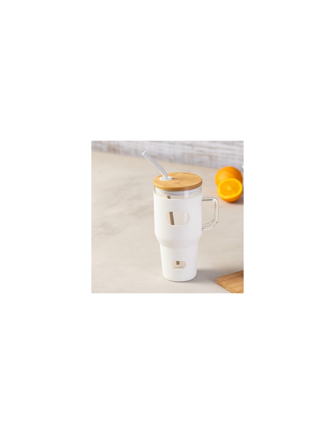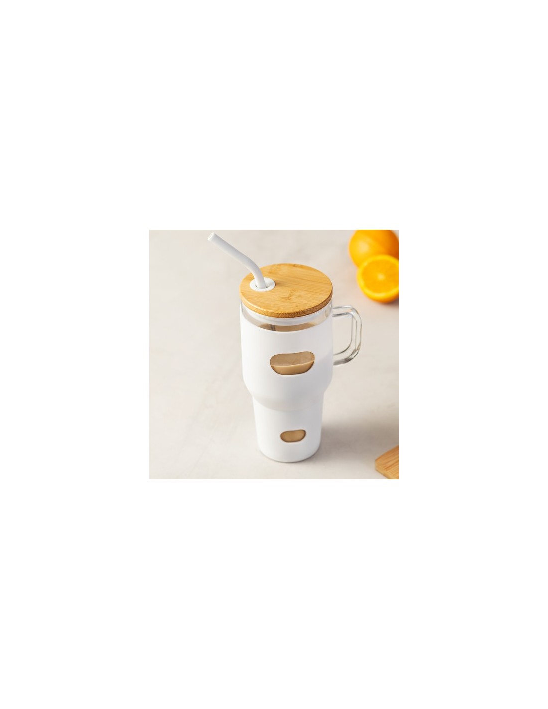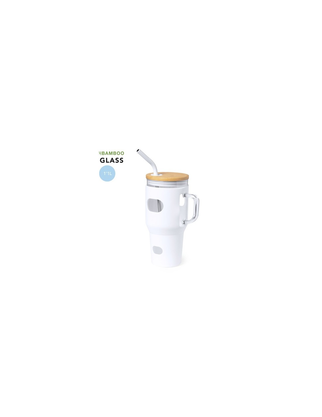 Tarro de gran capacidad (1,1 l) con cuerpo fabricado en resistente cristal, que ofrece una resistencia y durabilidad excepcionales, alargando su vida útil y pudiendo ser reutilizado infinidad de veces. Incluye asa para cómodo transporte y funda protectora en suave silicona. Tapa en bambú a presión, con orificio para pajita, y pajita reutilizable de acero inoxidable, con la punta recubierta en silicona para disfrutar de las bebidas de manera cómoda y segura.Presentado en caja individual de diseño kraft. 1,1 L. Funda Silicona Composition : Cristal/ Bambú.