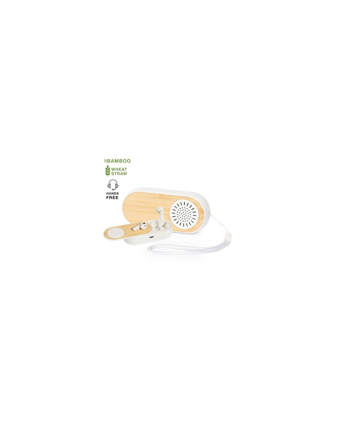 Auriculares altavoz fabricados en bambú y caña de trigo. Con Bluetooth 5.0. Contenido:Auriculares de diseño intraulares con botón de control integrado, base de carga a juego y luz LED de estado de carga. Altavoz Bluetooth de 3W y función manos libres.Batería recargable de 30 mAh en cada auricular y base de 300 mAh. Presentados en caja individual de diseño con manual de instrucciones en español e inglés.Elaborado con elementos vegetales para así fomentar la utilización de materias primas naturales y reducir las emisiones contaminantes. Conexión Bluetooth. Potencia Sonido 3W. Batería 30 mAh/ Base Carga 300 mAh Composition : Caña de Trigo/ ABS/ Bambú.