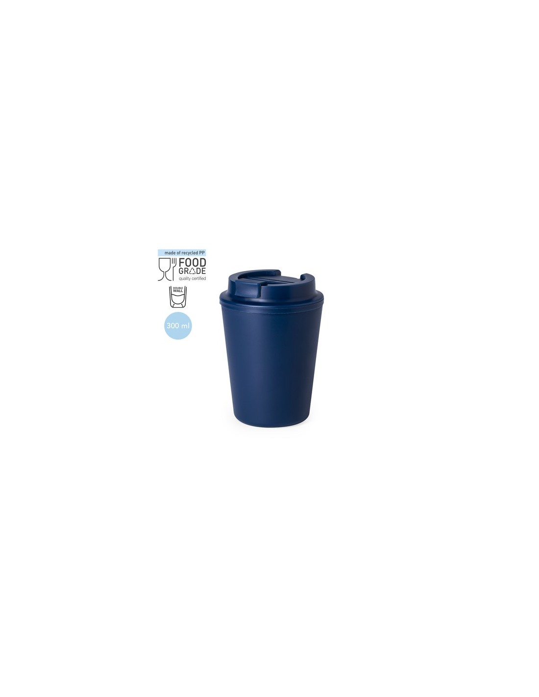 Vaso térmico fabricado en resistente PP de doble pared y 300ml de capacidad de color mate. Tapa con dosificador y abrefácil, libre de BPA. Es ideal para tener en tu escritorio, mesa o en cualquier superficie donde disfrutar tranquilamente de tu bebida favorita. Con certificación Food Grade, garantizando la seguridad cuando los alimentos entran en contacto con el material usado para fabricar el producto. El PP reciclado es un plástico reciclado y altamente reciclable, de gran resistencia y apto para multitud de aplicaciones. 300 ml Composition : PP Reciclado.