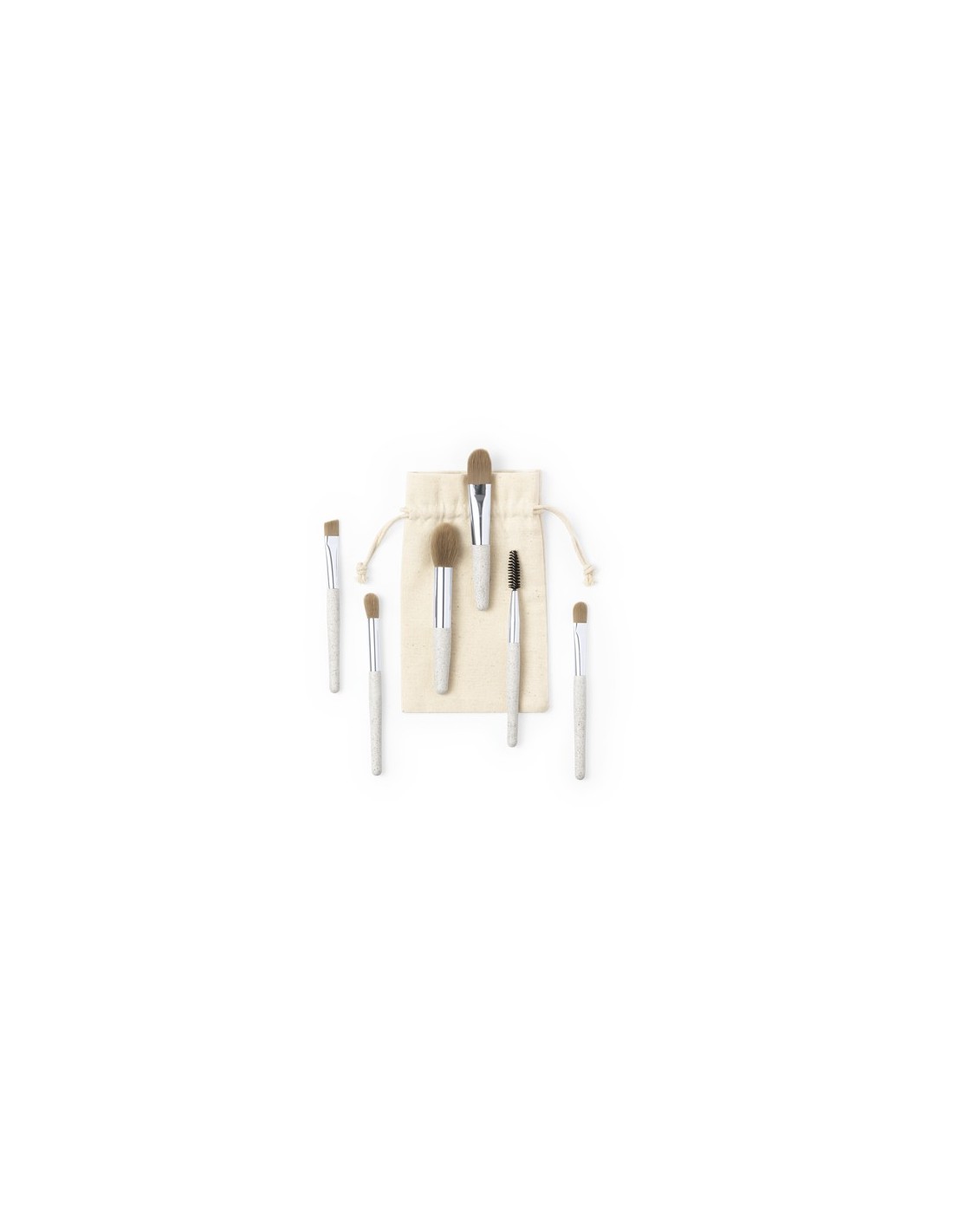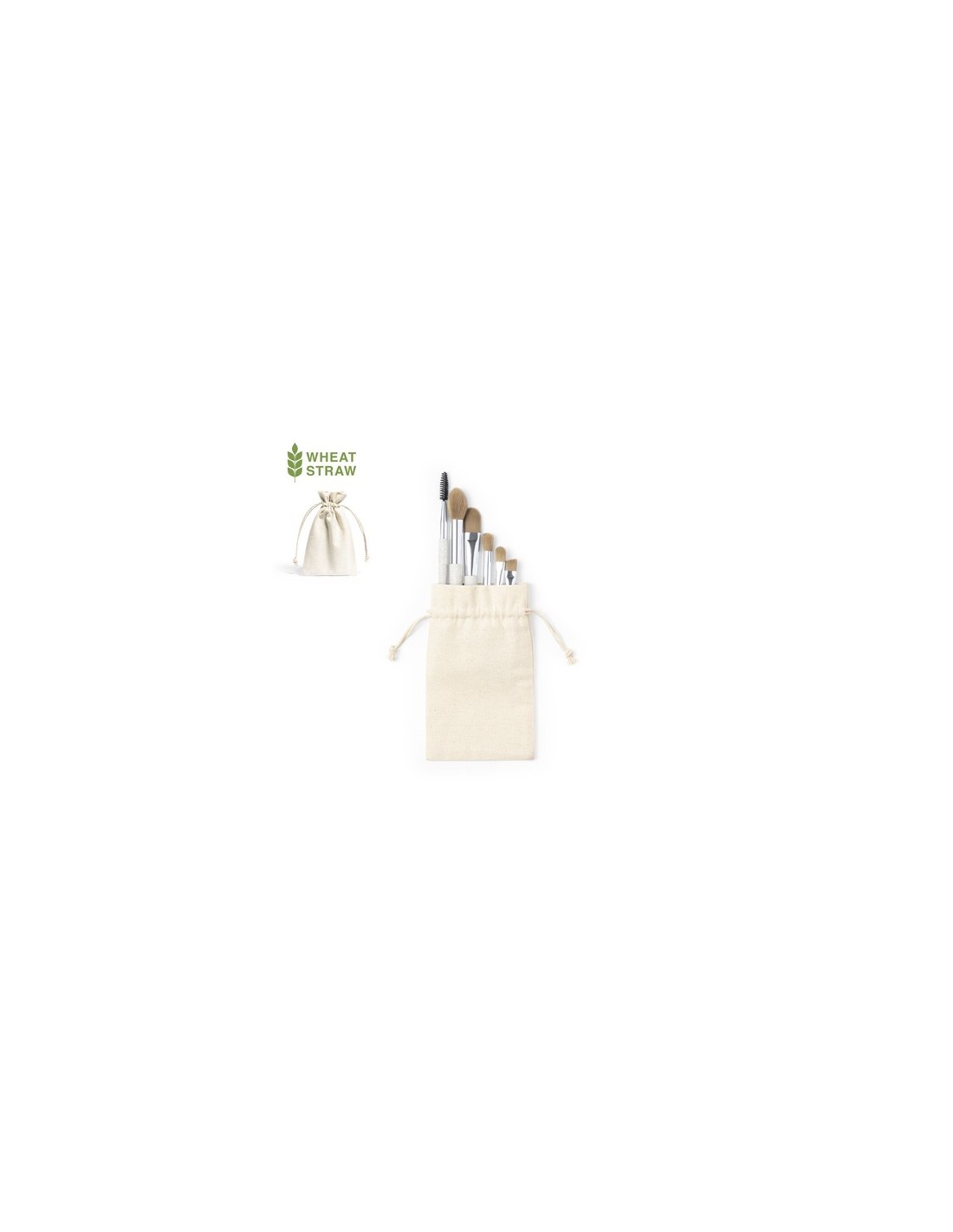Set de brochas de maquillaje, con 6 brochas para diferentes usos incluidas. Fabricadas en caña de trigo, para así fomentar la utilización de materias primas naturales y reducir las emisiones contaminantes. Set presentado en funda de algodón 100%, con cordón de cierre. 6 Accesorios. Funda Algodón Composition : Caña de Trigo/ PP.