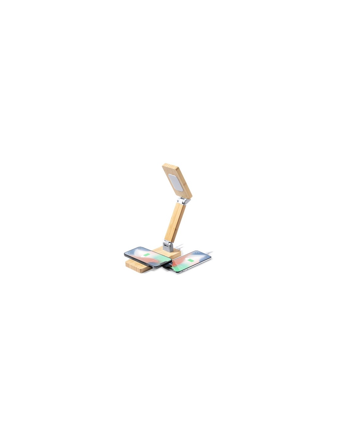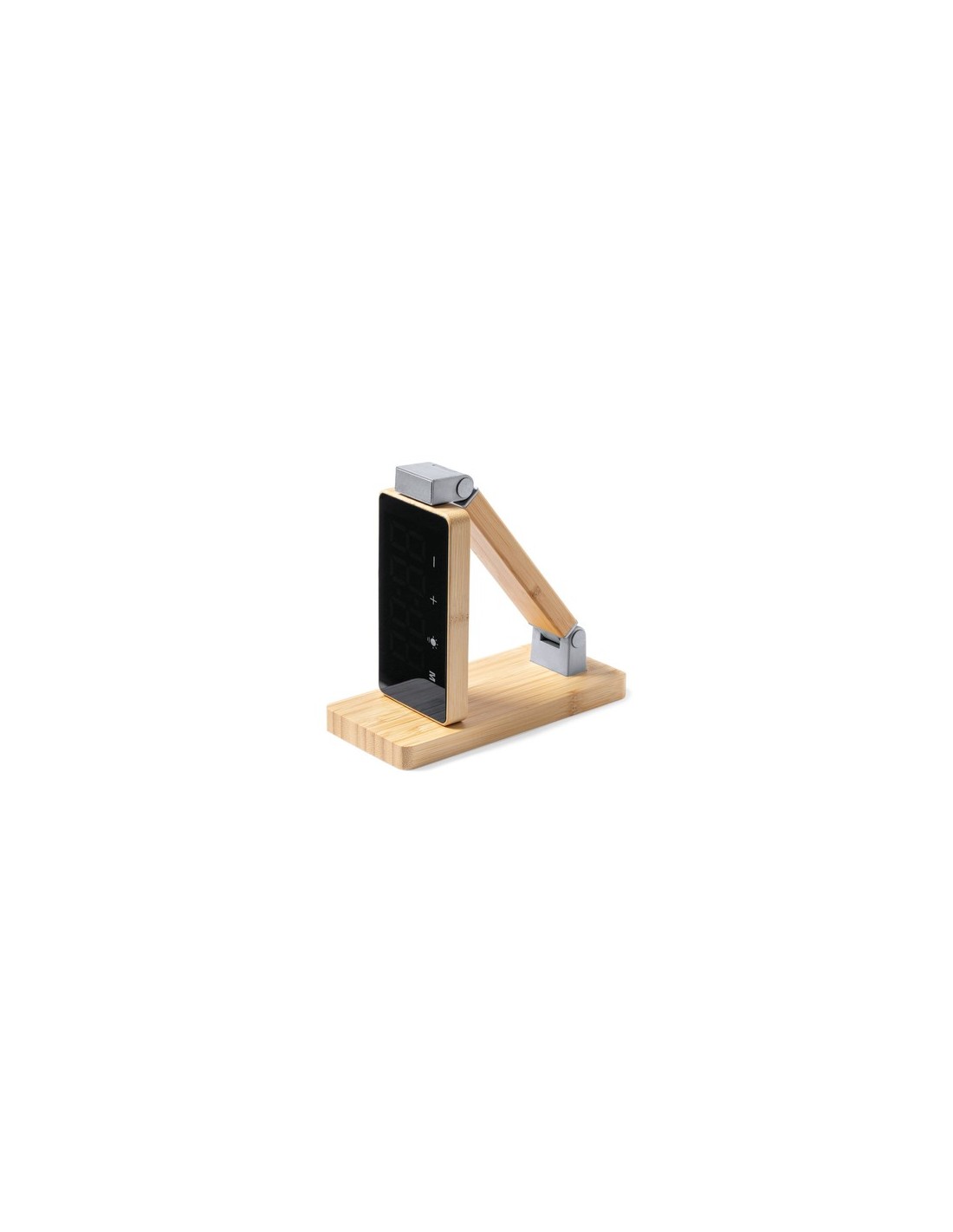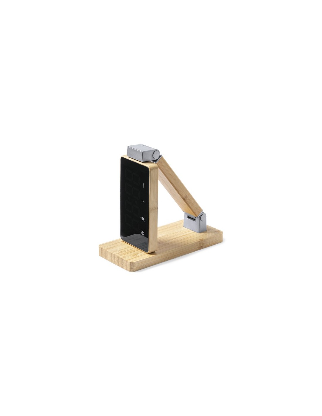 Reloj multifunción con pantalla táctil retroiluminada y cargador inalámbrico 15W integrado, con salida USB(5V DC 2A). Plegable y fabricado en bambú, con funciones fecha/hora y alarma. Lámpara con 16 LEDs y 3 posiciones de iluminación, con intensidad de luz regulable. Cable de carga Tipo C incluido y compatible con dispositivos equipados con tecnología de carga inalámbrica Qi. Presentado en caja individual de diseño kraft, con manual de instrucciones en español en inglés.Fabricado conforme a los estándares RoHS y en cumplimiento con los siguientes requisitos de seguridad:Sistema de protección contra sobrecalentamiento.Sistema de protección contra sobrecarga.Sistema de bloqueo para evitar cortocircuitos. Lámpara 16 Ledes. Plegable. 3 Posiciones de Luz. Intensidad de Luz Regulable. Cargador Inalámbrico 15W. Salida USB. Conexión USB Composition : Bambú.