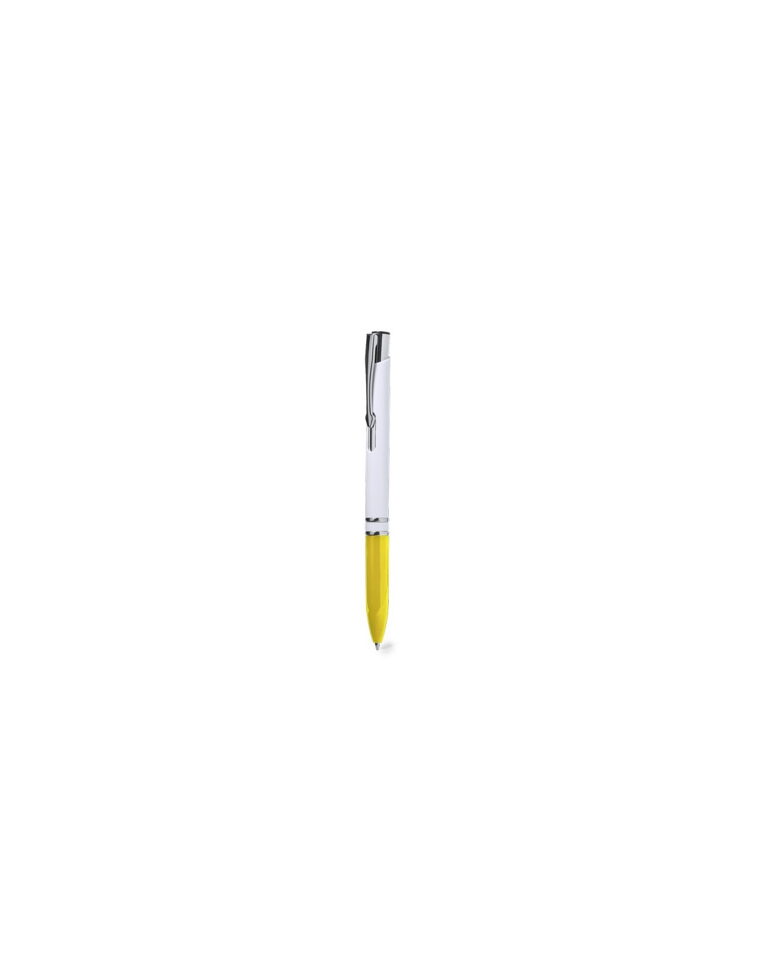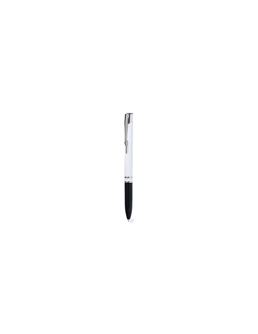 Elegante bolígrafo con mecanismo pulsador. Con cuerpo acabado en color blanco brillo y empuñadura en variada gama colores. Fabricado en resistente ABS acabado brillo. Con carga jumbo y tinta azul. Carga Jumbo
