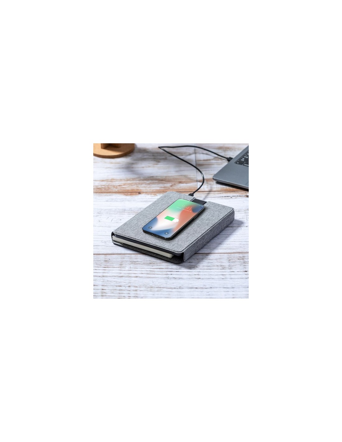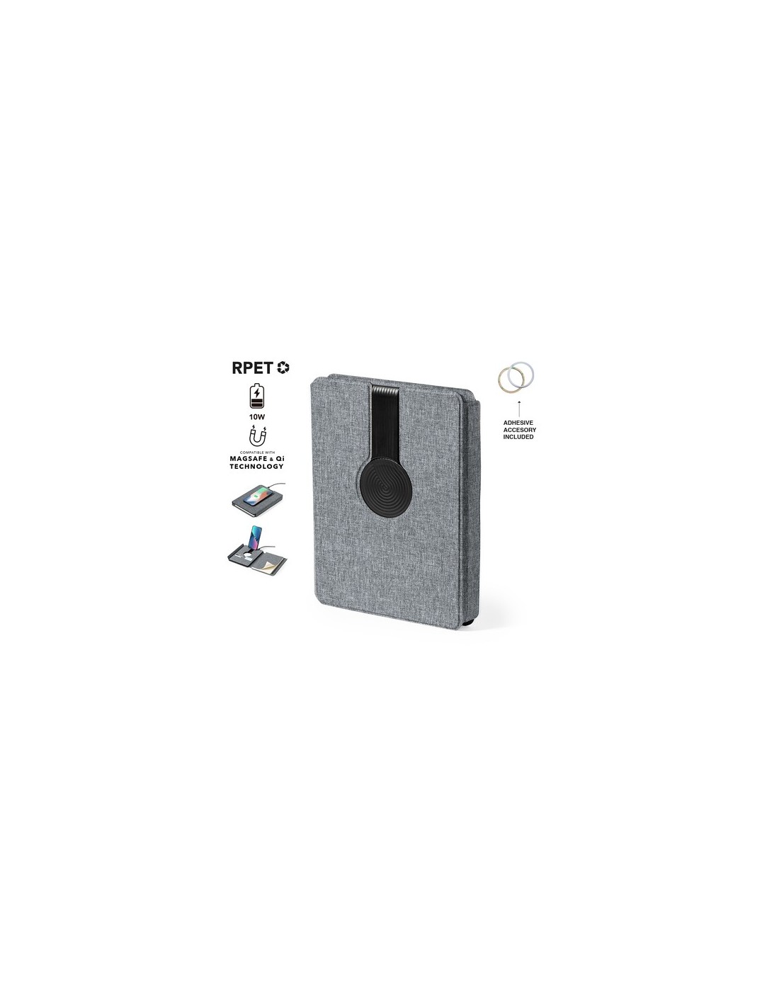 Carpeta/bloc multifunción con cierre magnético fabricada en poliéster 300D RPET, elaborado a partir de plástico reciclado, y etiqueta interior con distintivo RPET.Cargador inalámbrico de 10W, con fijación magnética y multiposición, integrado en portada, que permite usar el dispositivo mientras se está cargando. Accesorio anillo adhesivo incluido, compatible con todos los dispositivos equipados con tecnología Magsafe y Qi. Con cargador inalámbrico para smartwatch en la contraportada interior.Batería integrada de 5.000 mAh de capacidad de carga, con puerto Tipo C de entrada/salida y LEDs indicadores de estado de carga, con cable cargador incluido.Interior con soporte para smartphone y multitud de compartimentos para tarjetas. Soporte para bolígrafo y bloc interior A5 de 64 hojas, con disposición a una raya.Presentada en atractiva caja individual de diseño.Las capacidades mostradas en todas nuestras baterías auxiliares externas son reales, incorporando todas ellas baterías de grado A y no recicladas, con una vida útil de al menos 500 ciclos de carga y según normativa CE. Además, están fabricadas conforme a los estándares RoHS y en cumplimiento con los siguientes requisitos de seguridad:Sistema de protección contra sobrecarga del power bank.Sistema de protección contra descarga completa que proporciona una mayor durabilidad del power bank.Sistema de bloqueo para evitar cortocircuitos.Sistema de transferencia de carga constante, acorde con la capacidad del dispositivo de destino. Cargador Inalámbrico 10W. Power Bank 5000 mAh. Bloc 65 Hojas. Salida y Entrada Tipo C Composition : Poliéster 300D RPET.