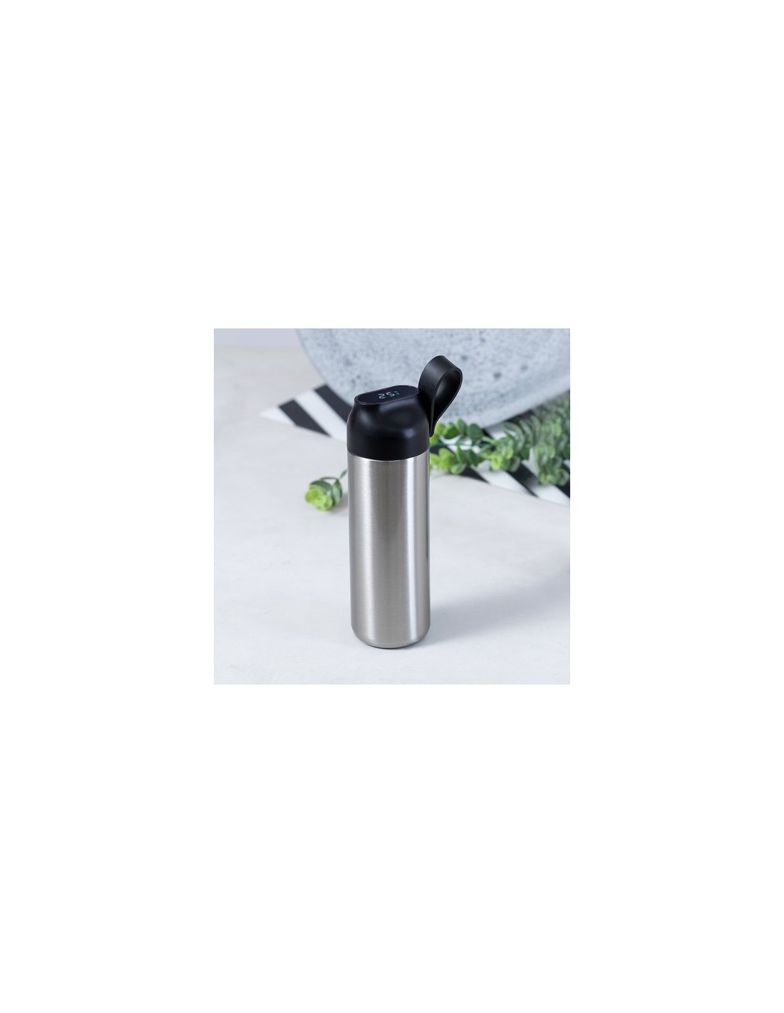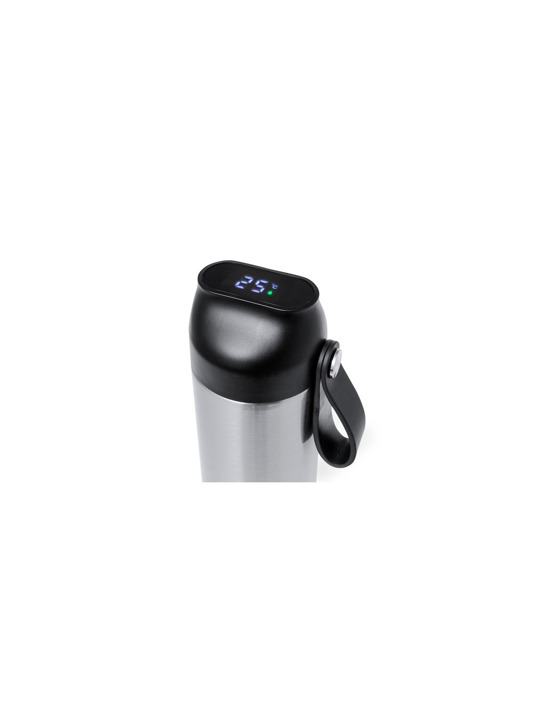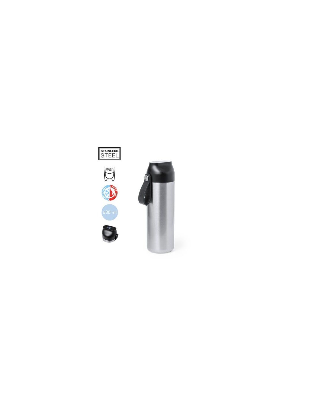 Bidón térmico de acero inox y doble pared de 630 ml de capacidad, con medidor de temperatura táctil en tapón y asa integrada. Con tapón de seguridad libre de BPA y presentado en atractiva caja individual de diseño Kraft y en bolsa reciclada. Alimentación a pilas (de botón incluida), con manual de instrucciones disponible en español e inglés. 630 ml. Medidor Temperatura Táctil Composition : Acero Inox.