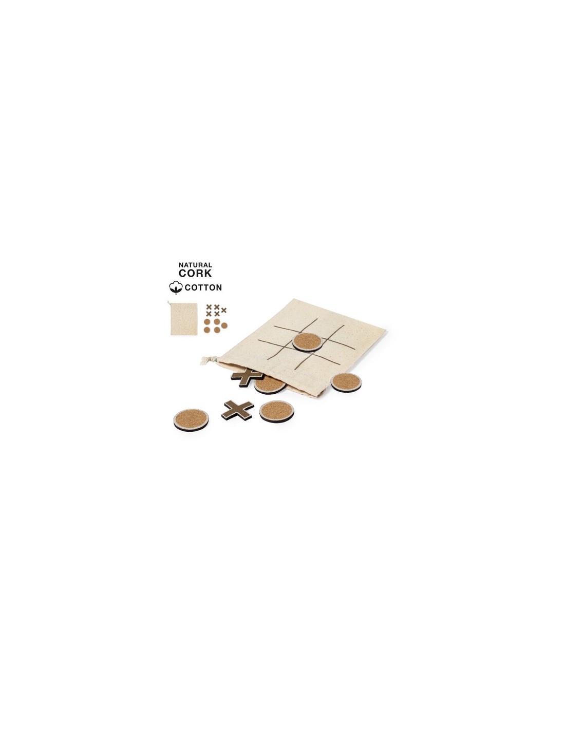 Juego tres en raya fabricado en corcho natural. Incluidas 5 fichas circulares y 5 fichas en cruz. Presentado en bolsa de algodón con cierre de cordón que sirve como tablero para jugar. 10 Piezas. Funda Algodón Composition : Corcho.