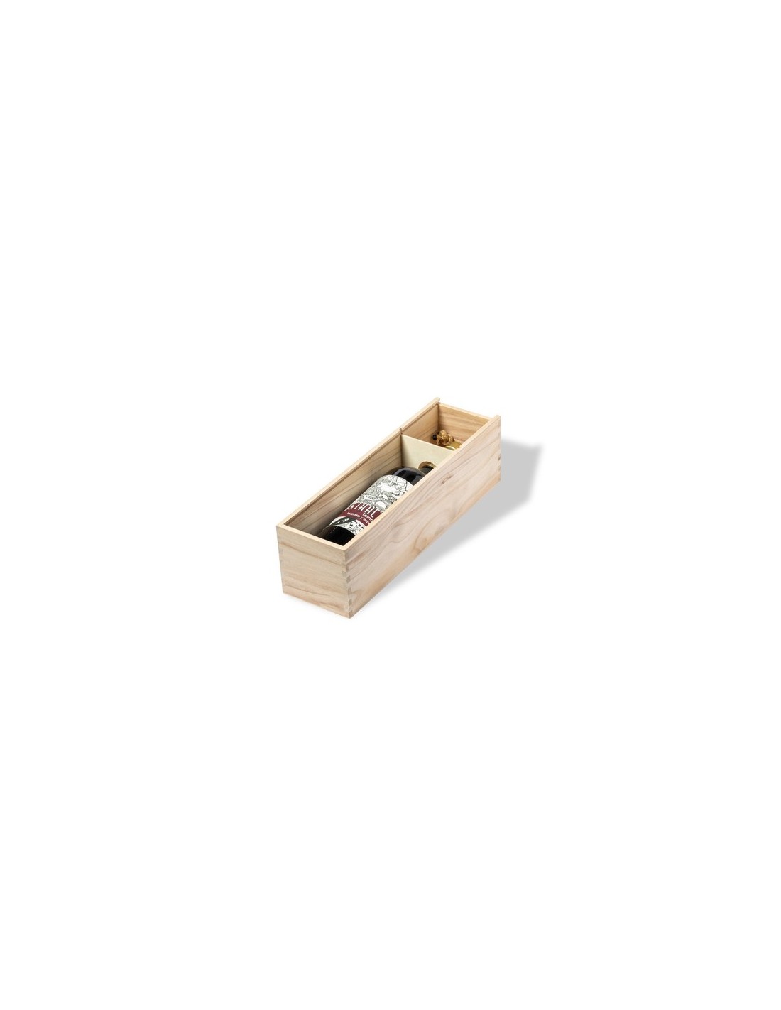 Caja de presentación premium para 1 botella, fabricada en madera natural de Paulownia, ligera y resistente. Interior con sujeción de seguridad para el cuello de la botella, con tapa deslizante y cordón de transporte. Composition : Madera.