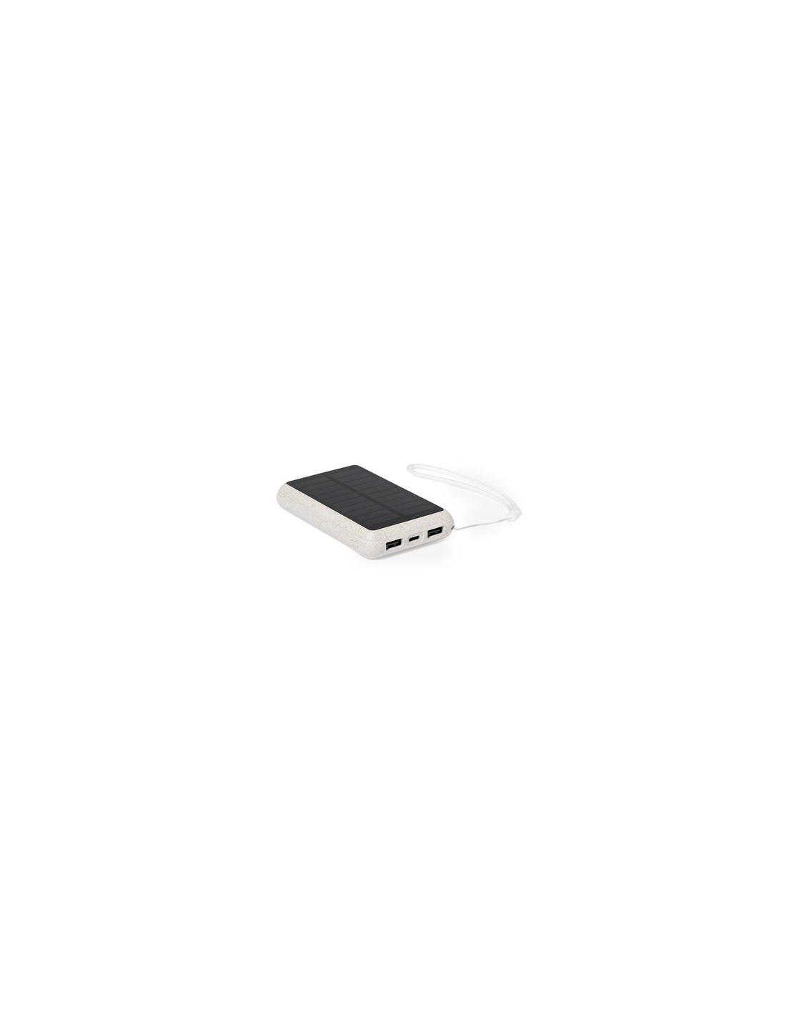 Batería auxiliar externa de recarga solar fabricada en fibra de trigo. De 5.000 mAh capacidad de carga. Con conector de entrada/salida Tipo C + salidas USB. Incluye panel fotovoltáico que brinda la facilidad de recargar la batería en cualquier espacio exterior sin necesidad de conexión. Presentado en una caja de diseño de kraft.Tipo C Entrada/Salida: 5V DC 2.4A, 12W2 Saidas USB: 5V DC 2.4A, 12WLas capacidades mostradas en todas nuestras baterías auxiliares externas son reales, incorporando todas ellas baterías de grado A y no recicladas, con una vida útil de al menos 500 ciclos de carga y según normativa CE. Además, están fabricadas conforme a los estándares RoHS y en cumplimiento con los siguientes requisitos de seguridad:Sistema de protección contra sobrecarga del power bank.Sistema de protección contra descarga completa que proporciona una mayor durabilidad del power bank.Sistema de bloqueo para evitar cortocircuitos.Sistema de transferencia de carga constante, acorde con la capacidad del dispositivo de destino.La caña de trigo fomenta la utilización de materias primas naturales, reduciendo así las emisiones contaminantes. 5000 mAh. Carga Solar. 2 Salidas USB. Salida y Entrada Tipo C Composition : Caña de Trigo/ ABS.