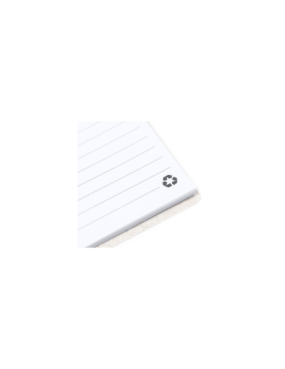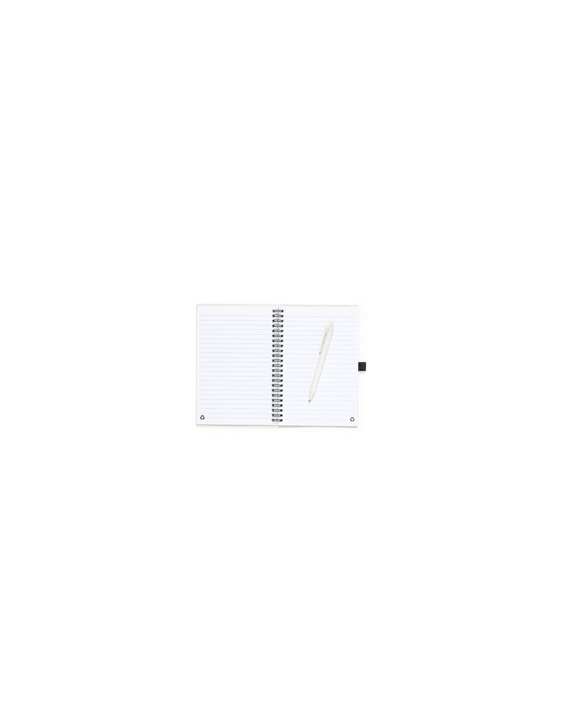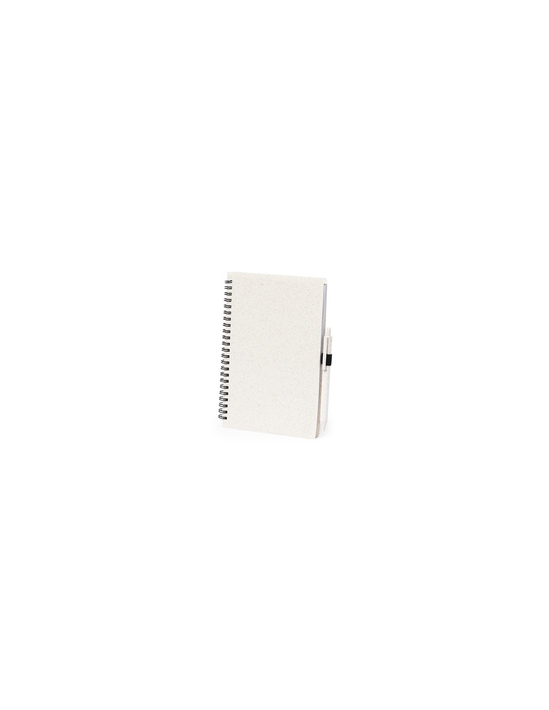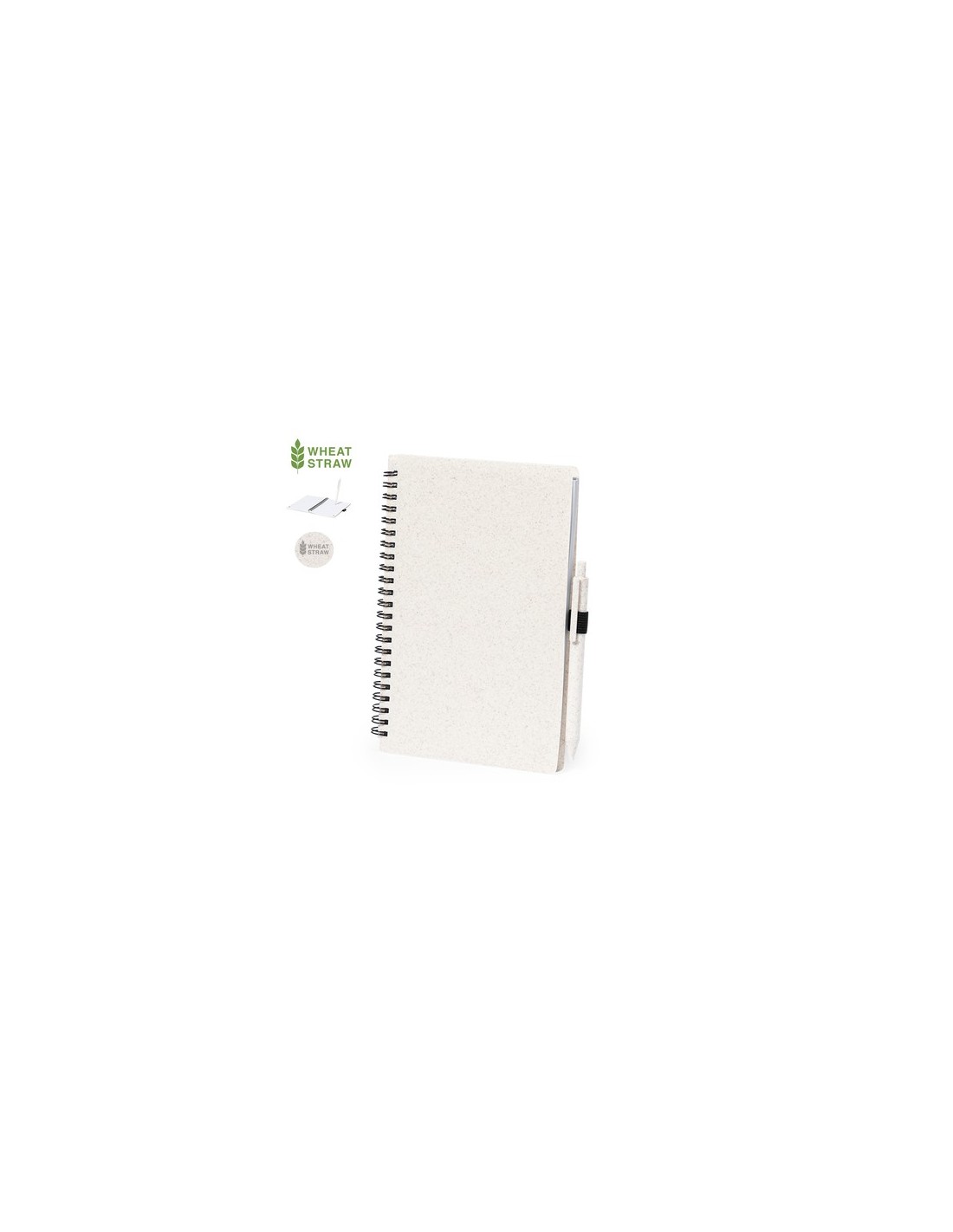 Set de libreta y bolígrafo. Libreta de anillas con tapas en caña de trigo y soporte para el bolígrafo. De 80 hojas con diseño eco y disposición a una raya. Bolígrafo de mecanismo pulsador, con cuerpo en caña de trigo y tinta azul. Con distintivo Wheat Straw. Presentado en bolsa individual reciclada.Elaborado con elementos vegetales para así fomentar la utilización de materias primas naturales y reducir las emisiones contaminantes. 80 Hojas. Bolígrafo Caña de Trigo/ PP Incluido Composition : Caña de Trigo/ PP.