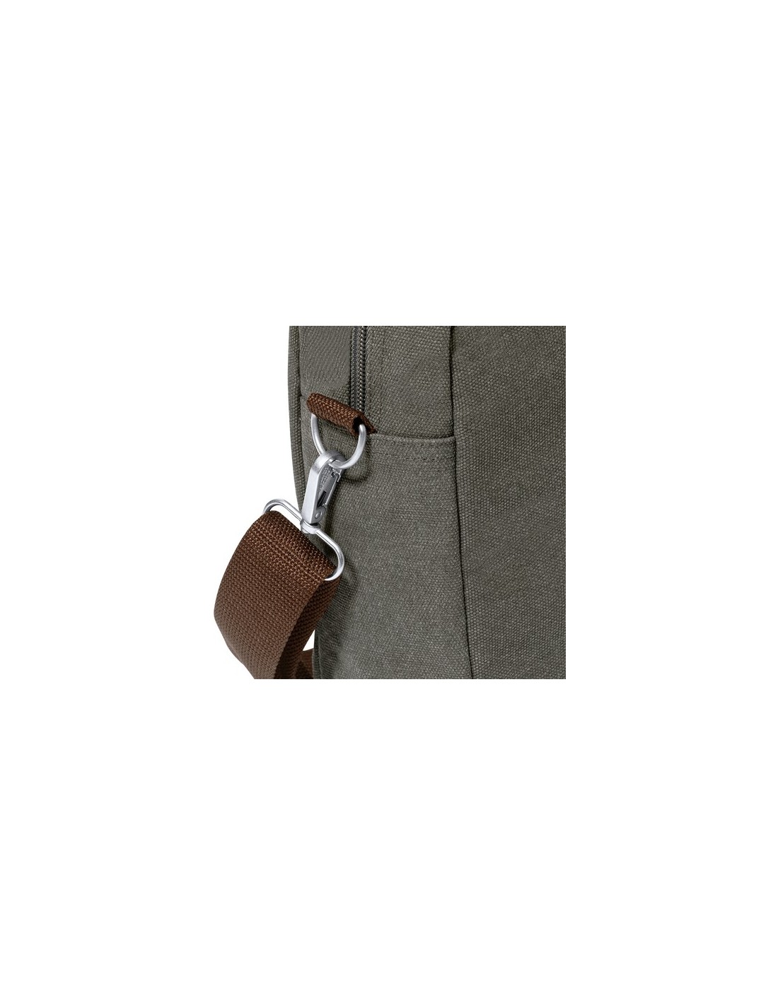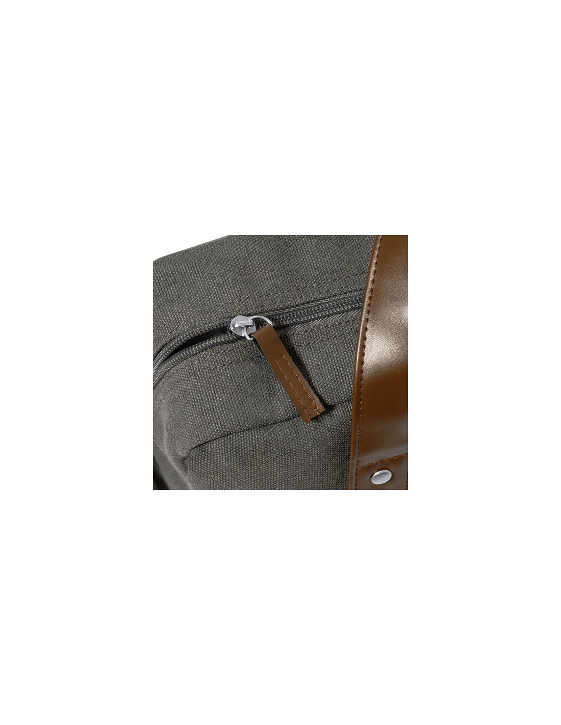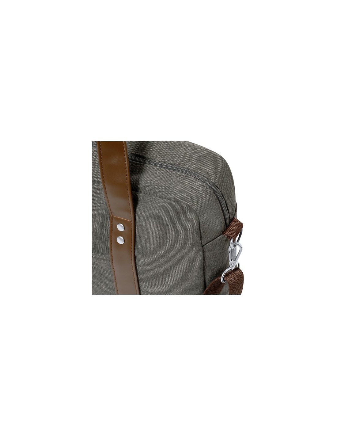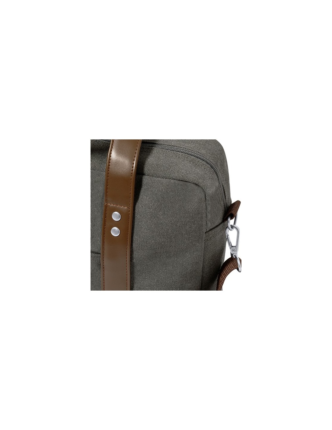 Portadocumentos bandolera de diseño atemporal, fabricado en resistente canvas de 475 g/m2, color gris, con cintas en polipiel y práctica cinta para hombro ajustable. Interior acolchado con compartimento ordenador portátil de hasta 15 pulgadas. Incluye práctico bolsillo en el exterior. Presentado en bolsa individual reciclada. Acolchado. Bolsillo Acolchado para Portátil Composition : Canvas/ Polipiel.