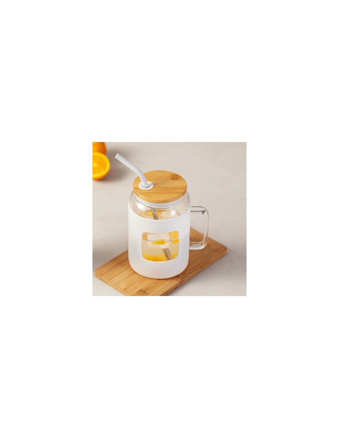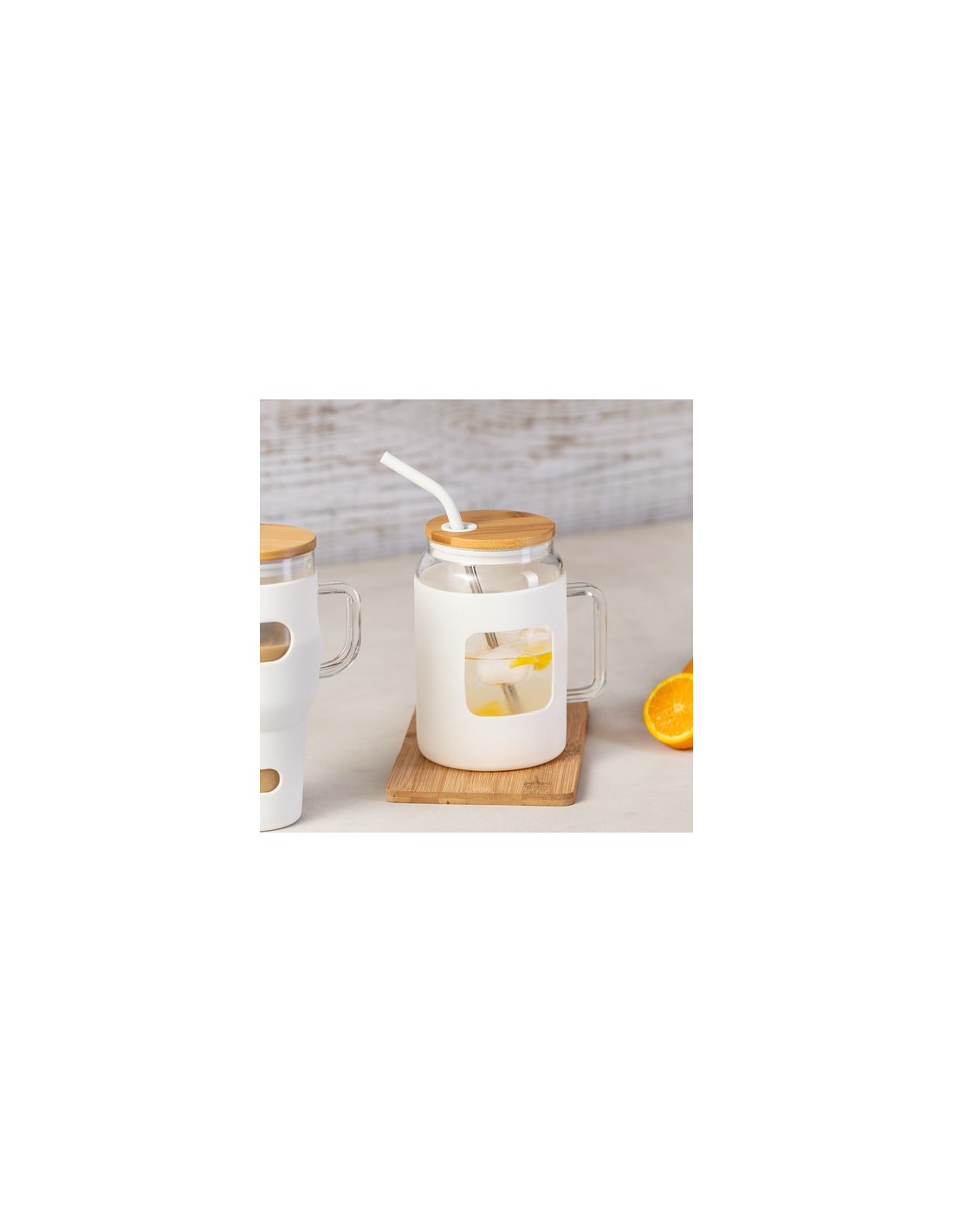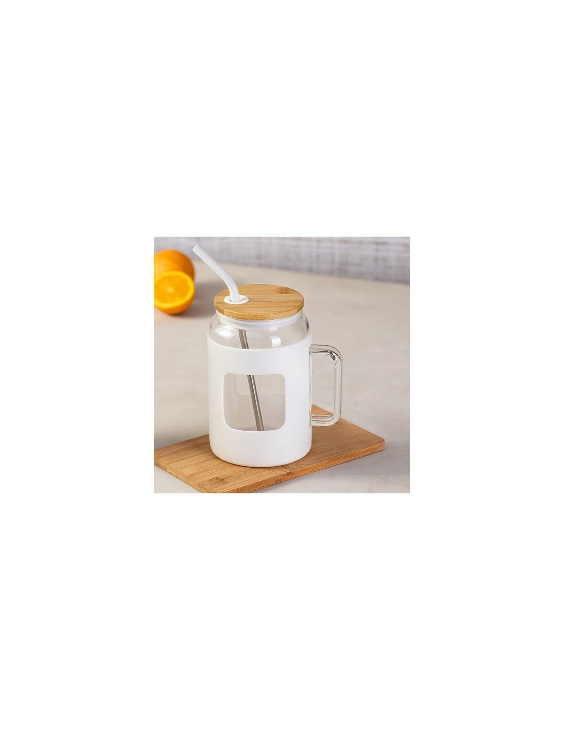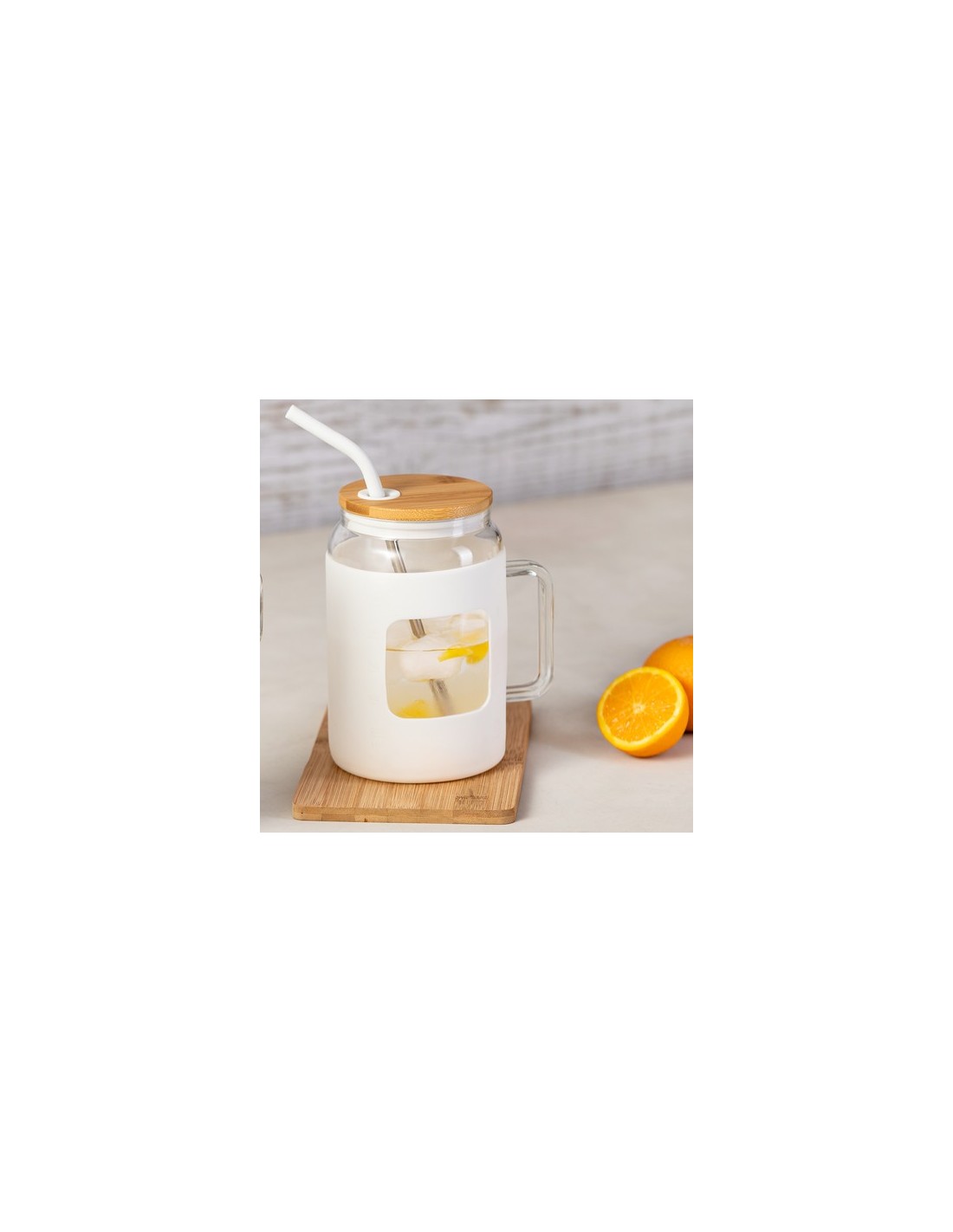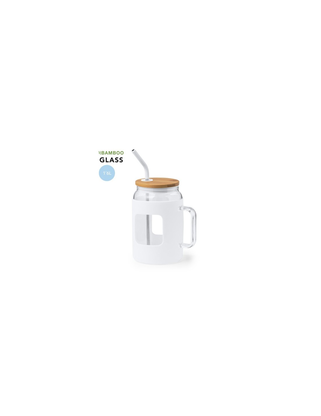 Tarro de gran capacidad (1,625 l) con cuerpo fabricado en resistente cristal, que ofrece una resistencia y durabilidad excepcionales, alargando su vida útil y pudiendo ser reutilizado infinidad de veces. Incluye asa para cómodo transporte y funda protectora en suave silicona. Tapa en bambú a presión, con orificio para pajita, y pajita reutilizable de acero inoxidable, con la punta recubierta en silicona para disfrutar de las bebidas de manera cómoda y segura.Presentado en caja individual de diseño kraft. 1,6 L. Funda Silicona Composition : Cristal/ Bambú.
