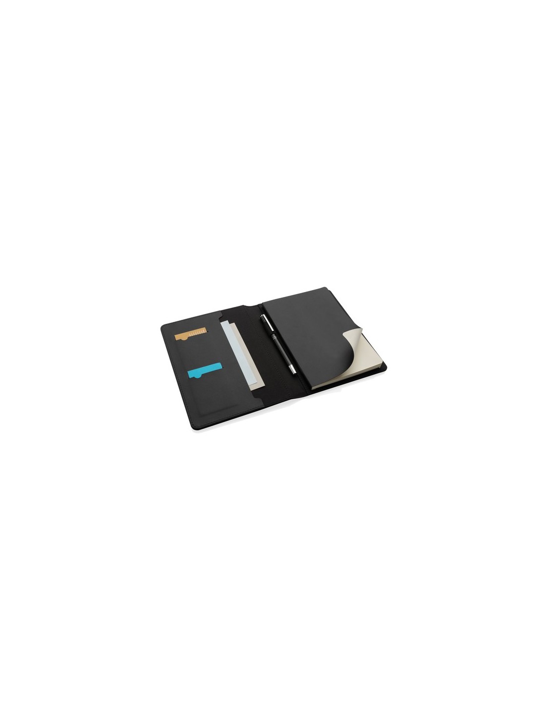 Eleva tu imagen profesional con este portafolio A5 elaborado con poliéster reciclado y PU reciclado con certificación RCS. En el interior encontrarás 3 ranuras para tarjetas, un portabolígrafos y un bolsillo para documentos A5. Siempre organizado con el cuaderno A5 recargable con papel mixto color crema FSC® y gramaje de 80 g/m². Presentado en una caja de regalo FSC®, este portafolio combina estilo y funcionalidad. Confeccionado con poliéster 100% reciclado incrustado con el trazador AWARE™. Material : rPET, Papel Recycled Content Percent : 0 Conforme directiva Cadmio 91/338/EC, Conforme contenido de plomo U.S, Conforme PAHS content in Reach & ZEK 01-4-08, Conforme directiva Phtalate content, Libre de parafinas cloradas de cadena corta y media., certificado de Recycled Claim Standard, Reglamento (UE) 2023/1115 Reglamento de la UE contra la deforestación Packaging : Caja de regalo All print codes : Pad Print,Hot Stamping,Digital Transfer OS,Screen Transfer OS - Print code default : Tampografía - Parta derecha en medio del artículo - 80 x 40 mm - max color : 5 Social Audits : BSCI Total CO2 emissions : 0,91.