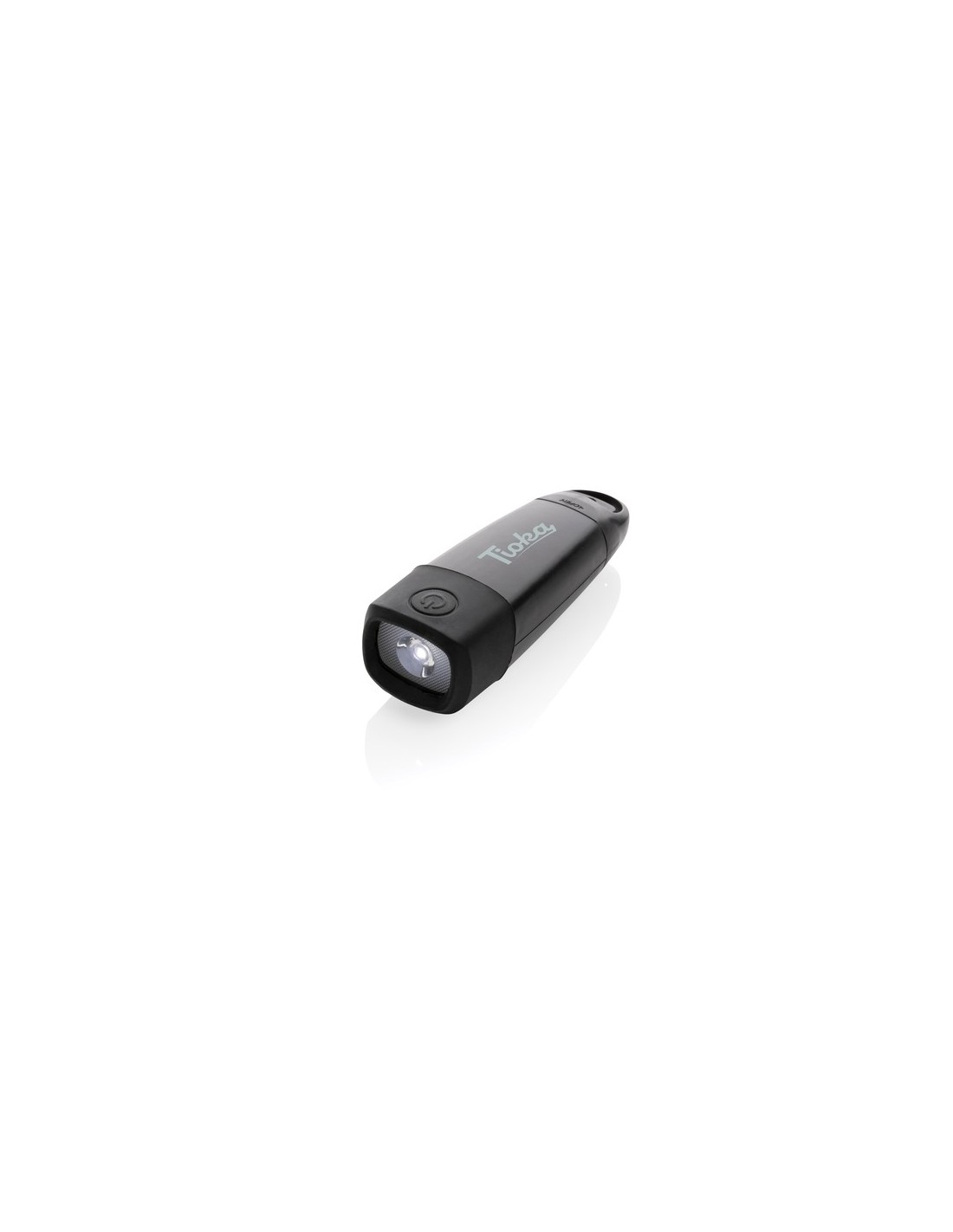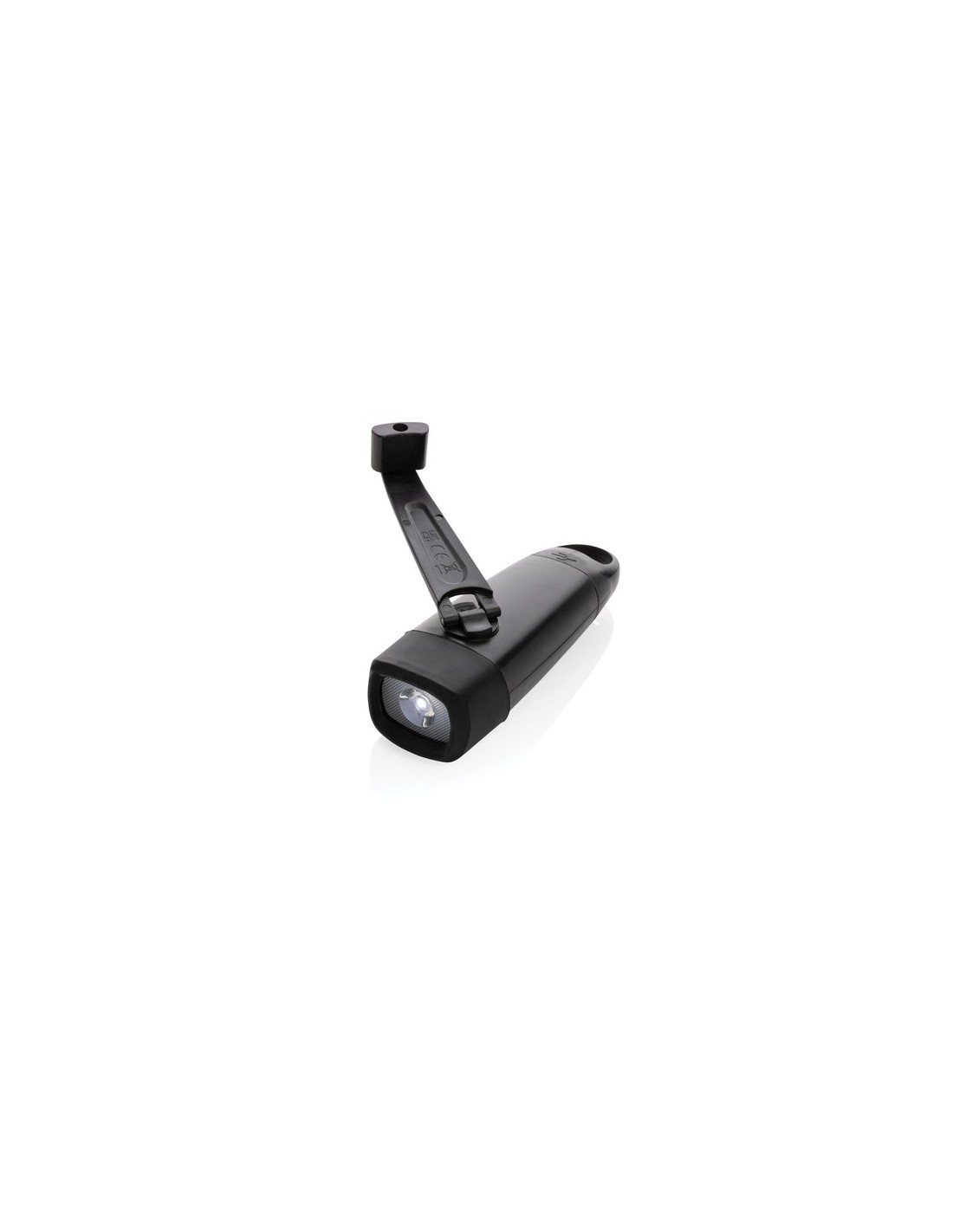 Linterna extra brillante con manivela fabricada con plástico ABS reciclado certificado RCS. Contenido reciclado total: 30% basado en el peso total del artículo. La certificación RCS garantiza una cadena de suministro de materiales reciclados completamente certificada. La linterna utiliza una batería de litio recargable de grado A de 620 mah, por lo que no es necesario reemplazar las baterías. Simplemente recárgalo a través de su toma USB. Luz LED de 120 lúmenes. Con puerto tipo C para recarga. Tiempo de funcionamiento con una carga: 2 horas. La manivela se puede utilizar para aumentar la energía en caso de emergencia. Material : ABS reciclado Recycled Content Percent : 30 Conforme directiva bateria 2006/66EC, Conforme directiva Electromagnética 2014/30/EU, Conforme directiva de sustancias peligrosas 2011/65/EC & 2015/863, Conforme PAHS content in Reach & ZEK 01-4-08, Conforme directiva Phtalate content, Conforme directiva seguridad baterias Alcalinas EN62133, Libre de parafinas cloradas de cadena corta y media., Conforme directiva EN60950-1 a la protección contra descargas eléctricas y peligros de energía, certificado de Recycled Claim Standard WEEE Battery : 1 Li-poli - 12 g. Packaging : Caja de regalo All print codes : Pad Print - Print code default : Tampografía - parte frontal del artículo - 15 x 50 mm - max color : 5 Social Audits : BSCI Total CO2 emissions : 0,82.