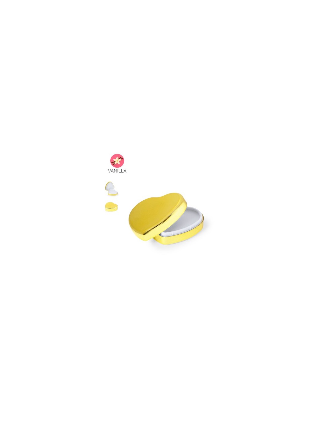 Bálsamo labial en elegantes colores dorado, plateado y oro rosa con forma de corazón. Aroma vainilla, con protección SPF15 y dermatológicamente testado. Con tapa a presión y acabado brillo. SPF15. Aroma Vainilla
