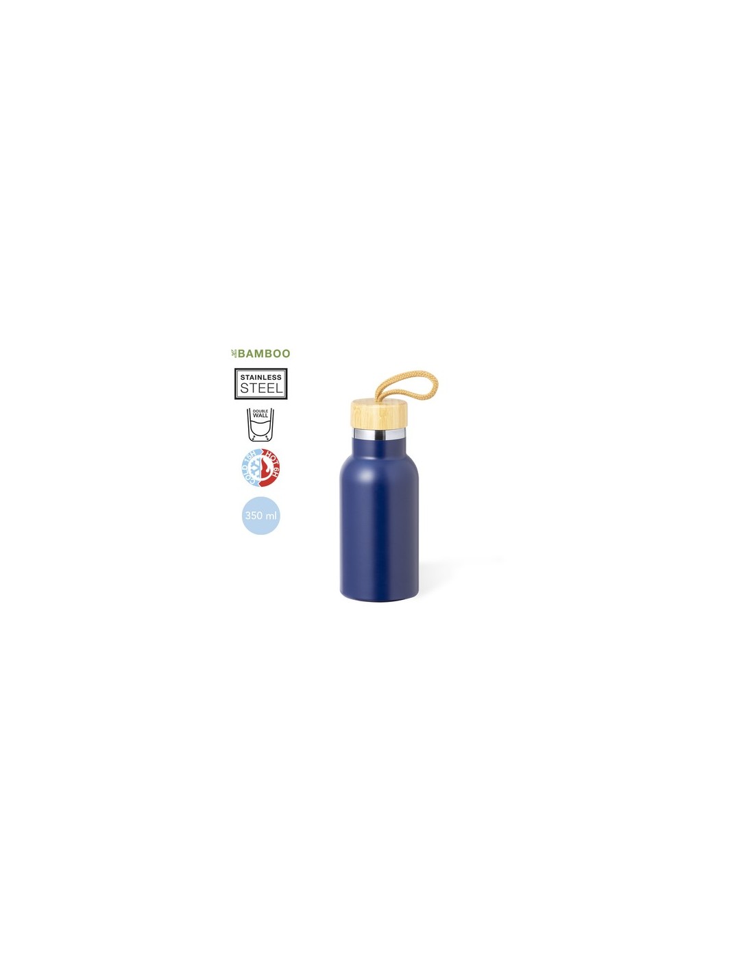 Bidón térmico de 350 ml de capacidad, fabricado en acero inox de doble pared. Incluye original tapón a rosca en bambú y asa para transporte en color natural. Disponible en variada gama de colores y presentado en caja individual de diseño kraft. 350 ml Composition : Acero Inox/ Bambú.