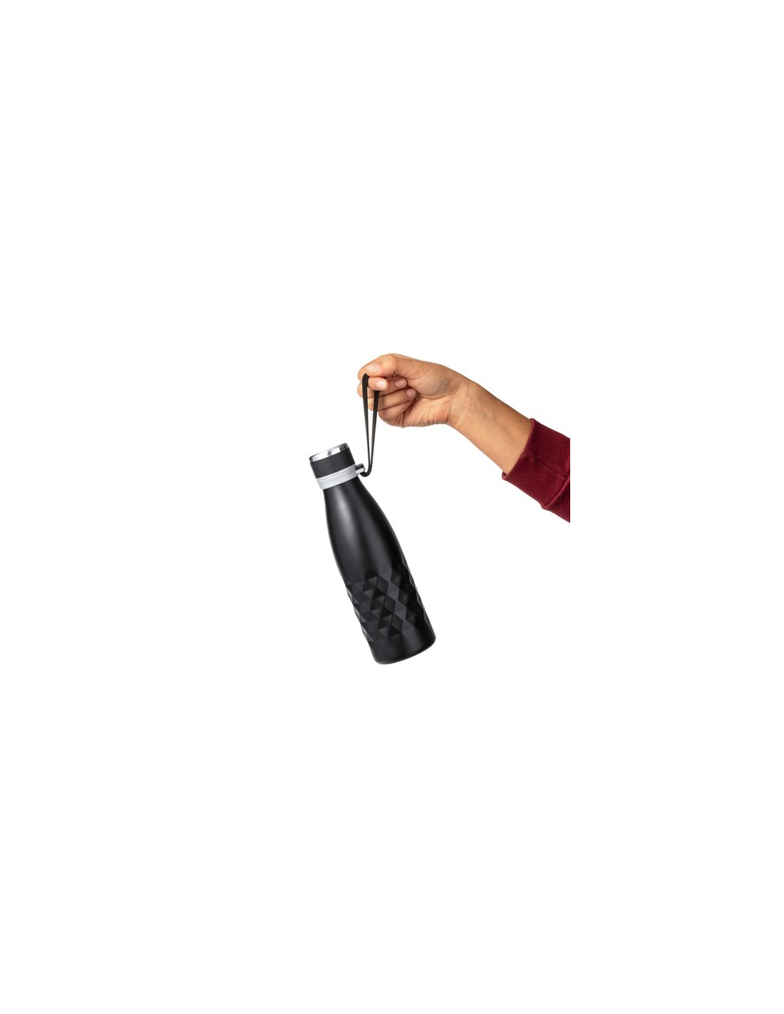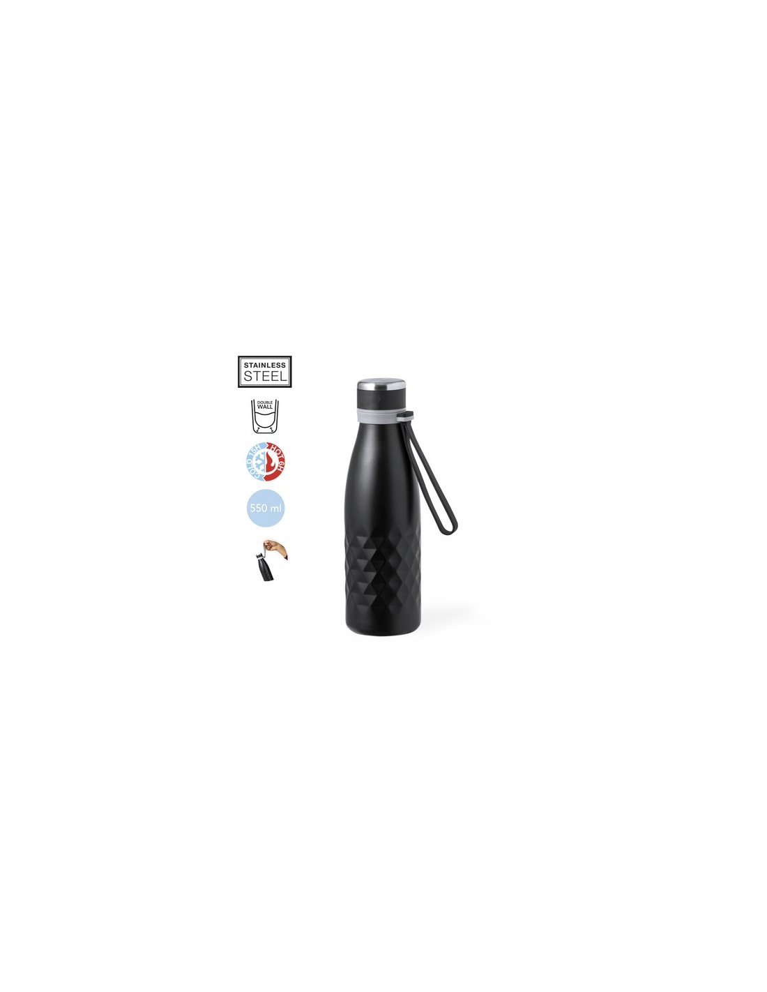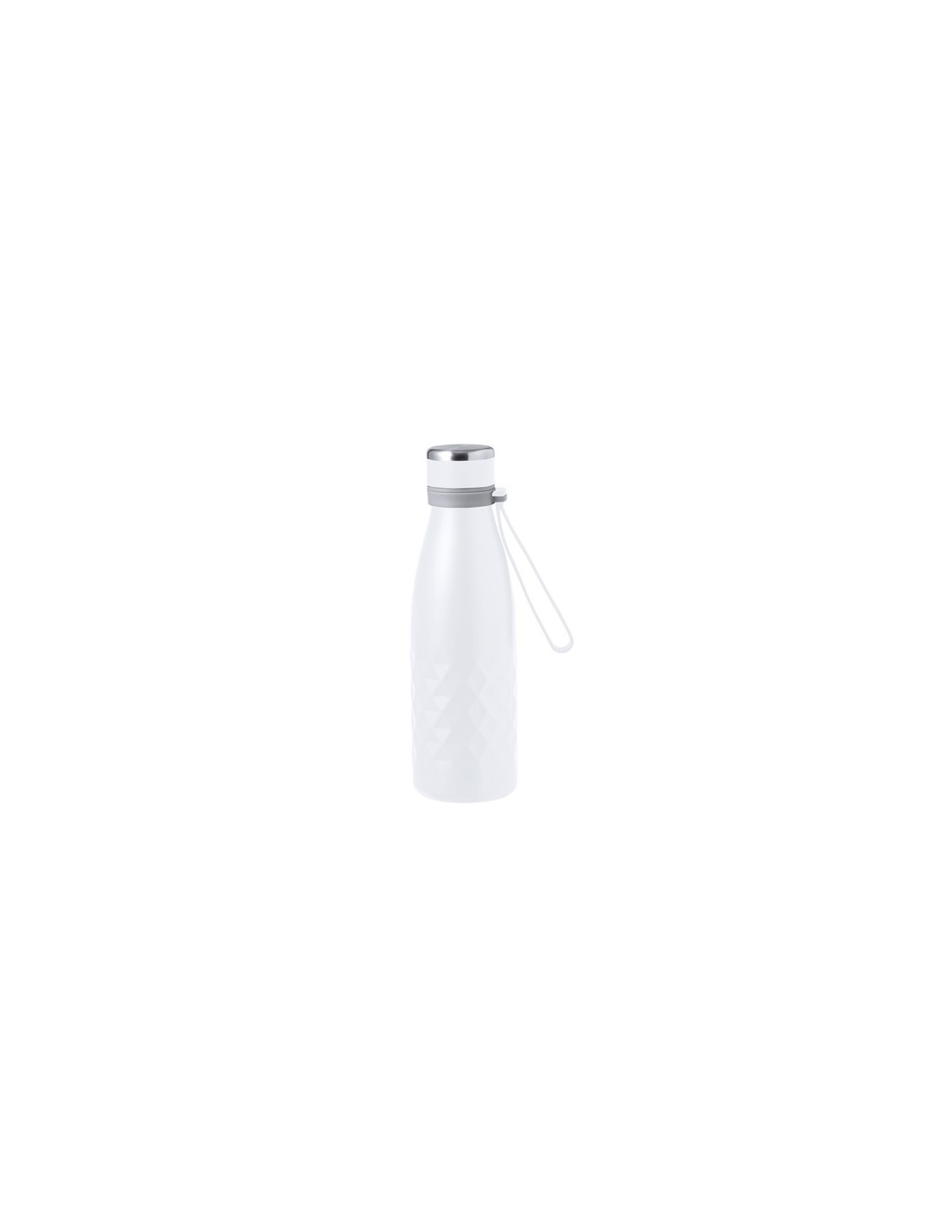 Elegante bidón térmico de 550 ml de capacidad, fabricado en acero inox de doble pared, con tapón a rosca para un óptimo sellado. Incluye una cómoda asa a juego en agradable silicona. Disponible en variada gama de colores metalizados, con elegante patrón en rombo alrededor del cuerpo. Presentado en caja individual de diseño kraft. 550 ml Composition : Acero Inox.