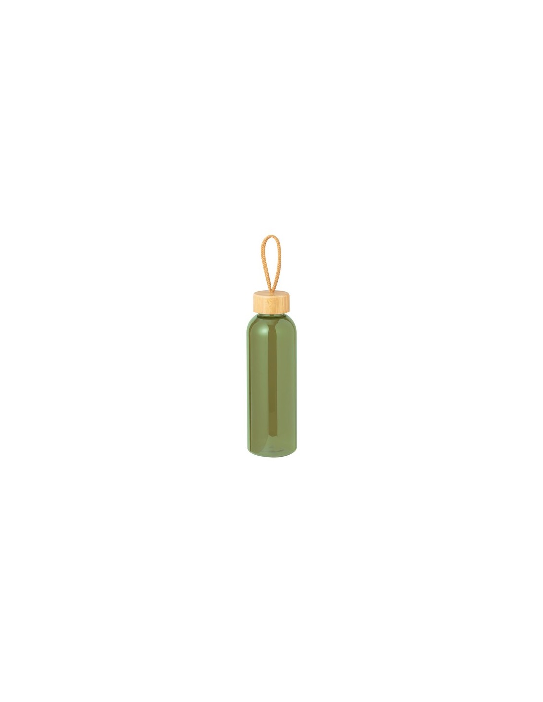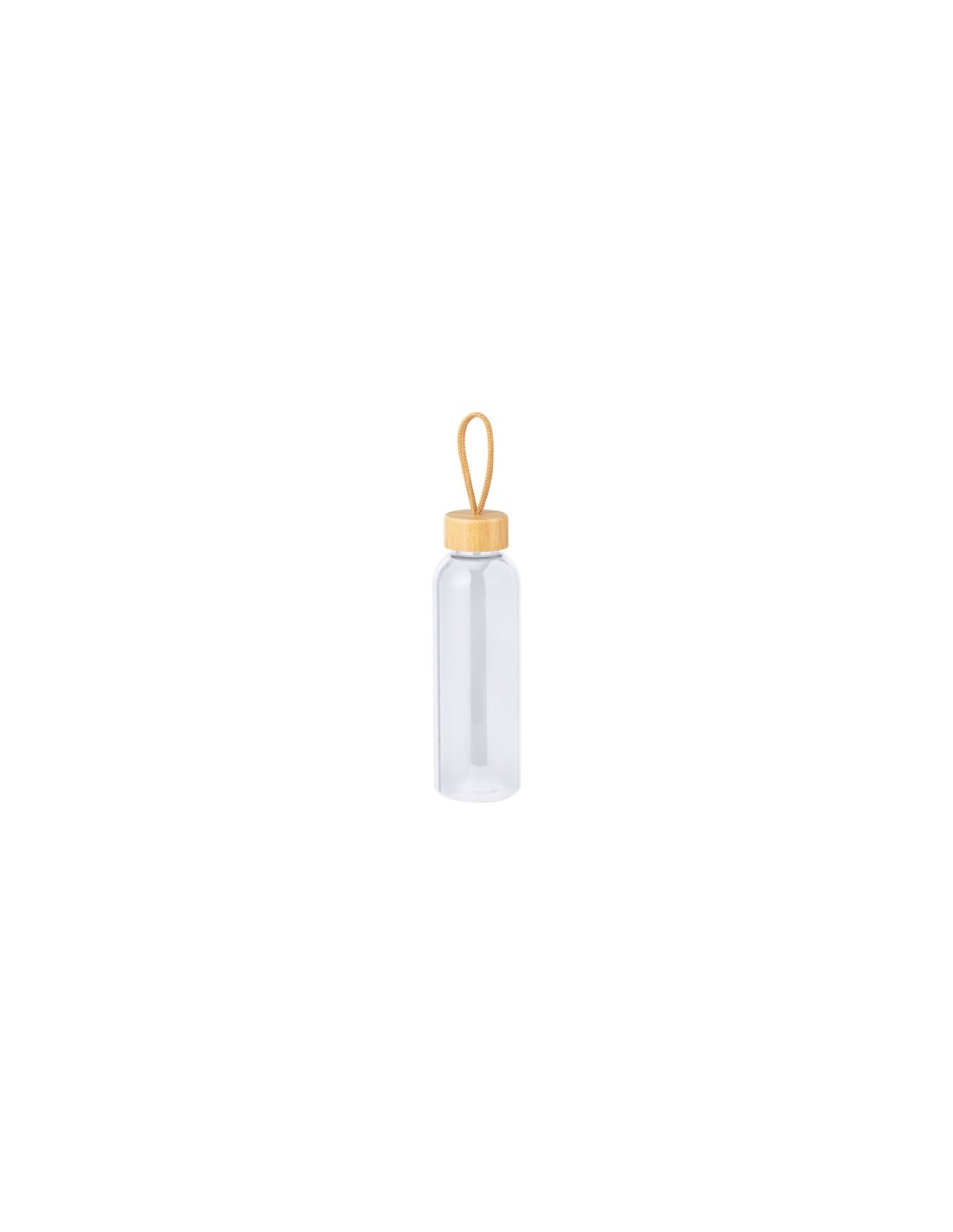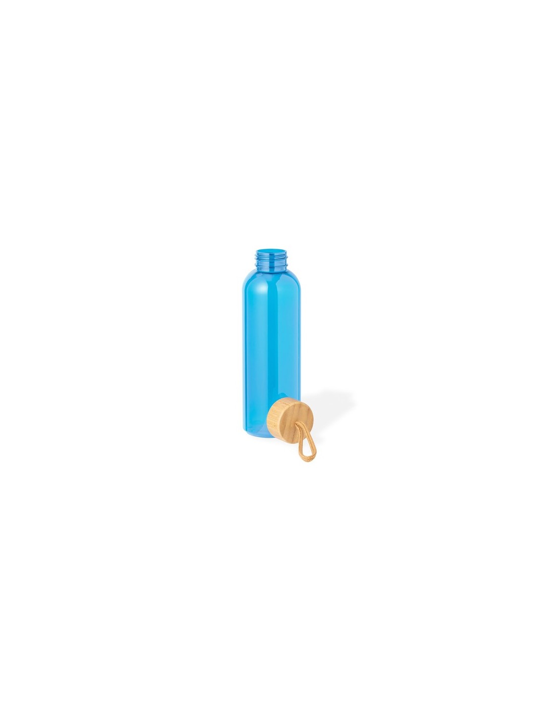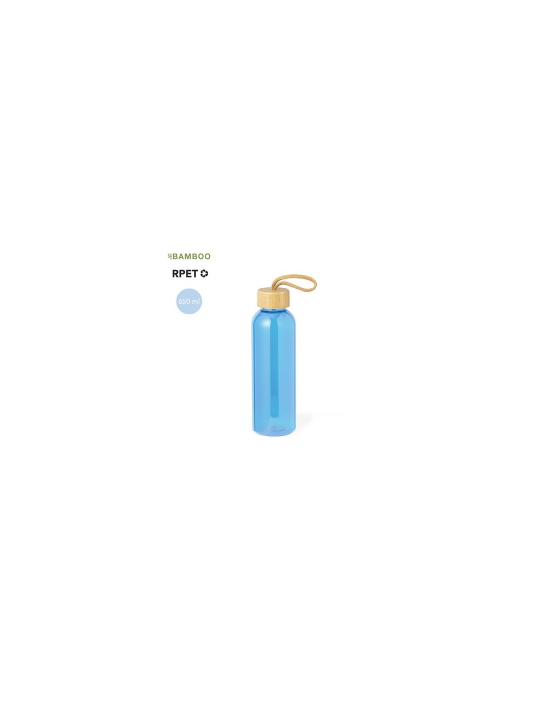 Bidón fabricado en RPET de 650 ml de capacidad, libre de BPA. Tapón a rosca en bambú, con cordón de transporte trenzado. Disponible en variada gama de colores. Presentado individualmente en bolsa de papel. 650 ml Composition : RPET/ Bambú.