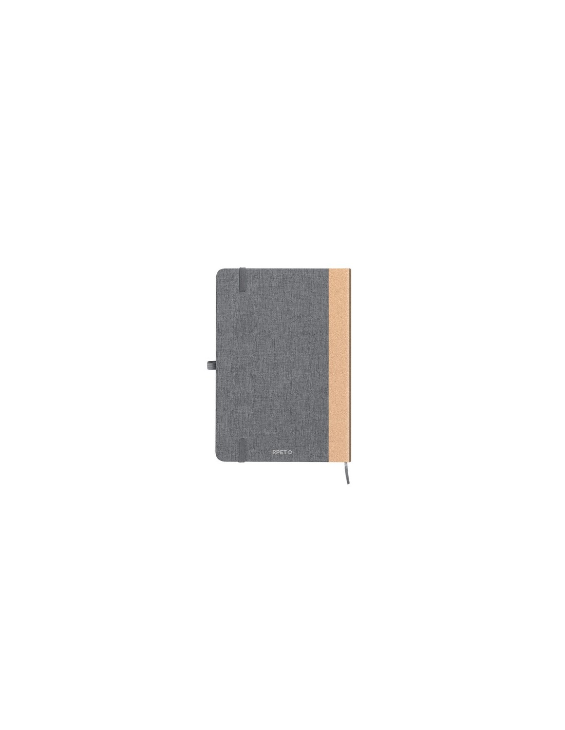 Bloc de notas con tapas rígidas fabricadas en RPET, con el lomo en corcho. Incluye interior con 80 hojas lisas, marcapáginas, elástico de cierre y soporte para bolígrafo a juego. logotipo RPET en contraportada y disponible en elegantes colores. Presentado en una bolsa individual de papel reciclado.El material RPET se elabora a partir de plástico reciclado, para así fomentar la reutilización de residuos plásticos y ayudar a la sostenibilidad del planeta. 80 Hojas Composition : Poliéster 300D RPET/ Corcho.