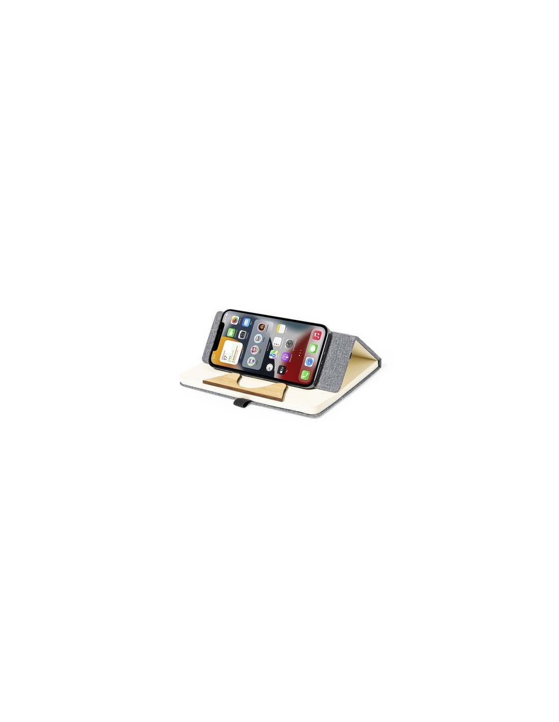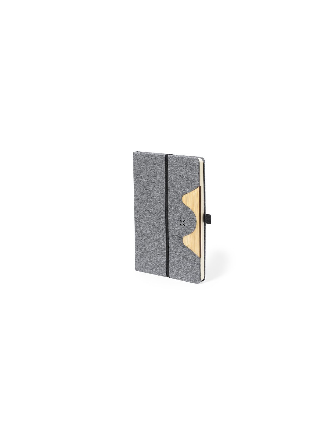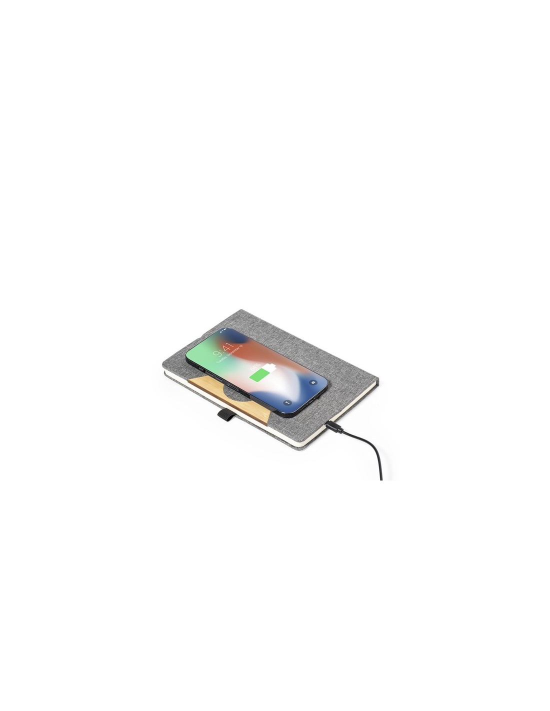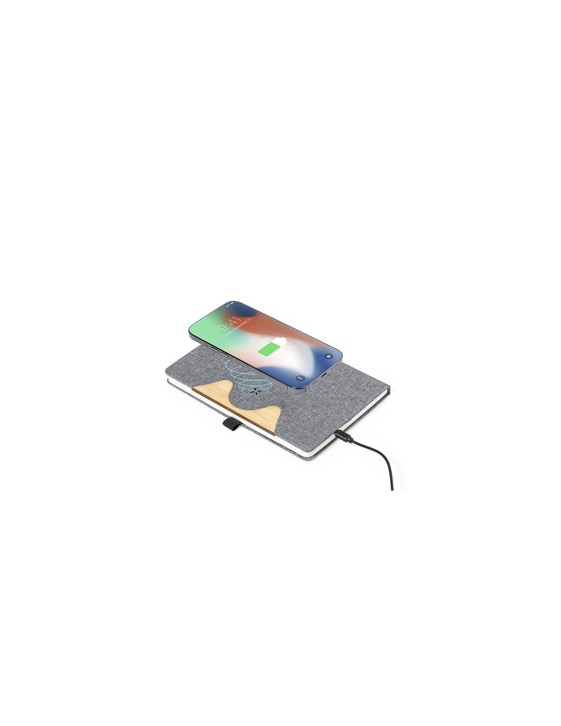 Bloc de notas cargador tamaño A5 y fabricado en resistente poliéster 300D RPET. Portada con detalle en bambú y cargador inalámbrico de 15W integrado, compatible con smartphones con tecnología de carga inalámbrica. Incluido cable de carga Tipo C y disponible manual de instrucciones en español e inglés. Con 80 hojas interiores de disposición a una raya y presentado en bolsa de papel reciclado. El material RPET se elabora a partir de plástico reciclado, para así fomentar la reutilización de residuos plásticos y ayudar a la sostenibilidad del planeta.Materiales como el bambú fomentan la utilización de materias primas naturales, reduciendo las emisiones contaminantes. Proviene de una planta de gran resistencia y versatilidad, con crecimiento y regeneración rápidos, siendo una excelente alternativa al uso de madera tradicional.Fabricado conforme a los estándares RoHS y en cumplimiento con los siguientes requisitos de seguridad: Sistema de protección contra sobrecalentamiento. Sistema de protección contra sobrecarga. Sistema de bloqueo para evitar cortocircuitos. Inalámbrico 15W. Portada Rígida. 80 Hojas Composition : Poliéster 300D RPET/ Bambú.