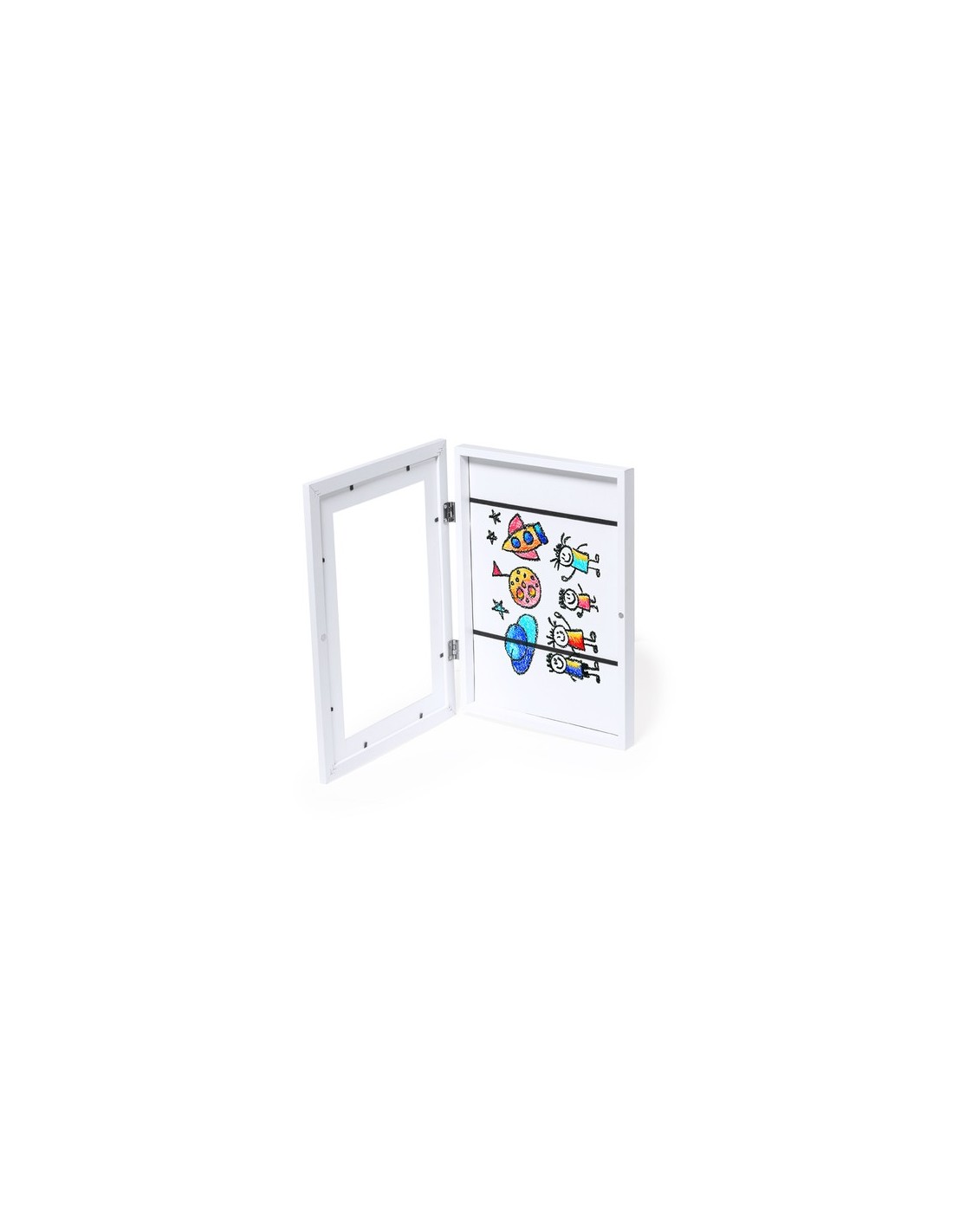 Elegante marco de arte que combina funcionalidad y estilo. Ofrece un compartimento para almacenar diseños de tamaño A4 sujetos por bandas elásticas, mientras que en su portada incorpora un marco para resaltar el diseño elegido. Se destaca por su apertura de bisagras y cierre magnético, garantizando un manejo práctico y seguro. Presentado de forma individual en caja de diseño kraft. Composition : MDF.