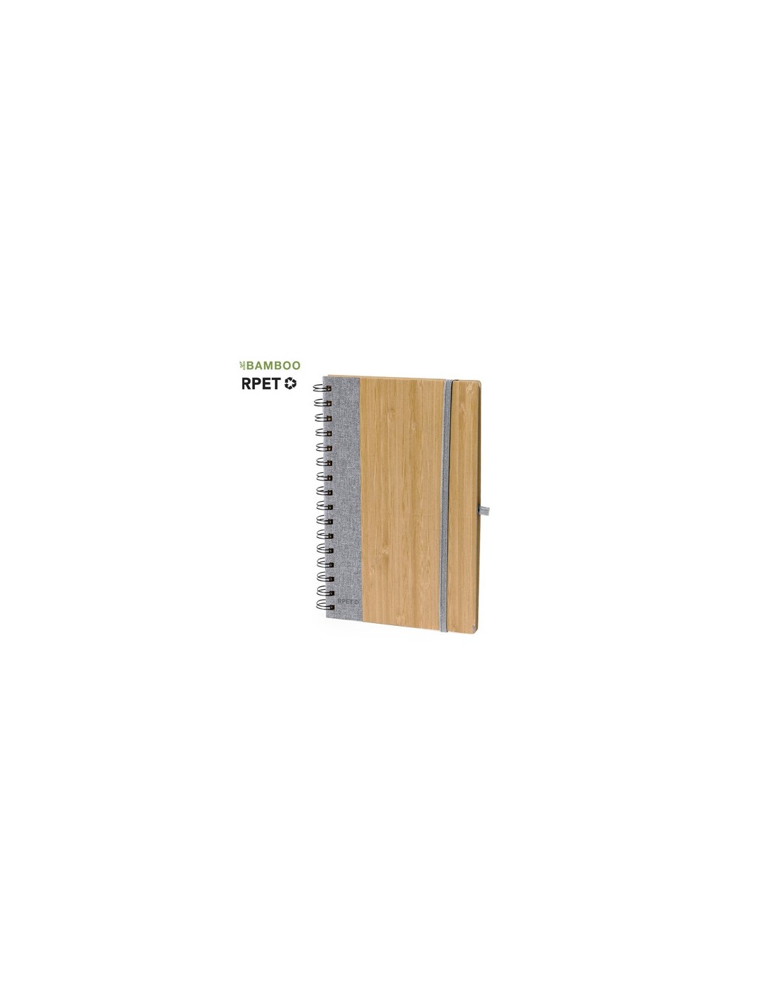 Libreta de anillas con tapas rígidas de bambú. Incluye 80 hojas con disposición a una raya de papel reciclado. Con cierre elástico, banda lateral, y soporte para bolígrafo a juego. Disponible en variada gama de colores, presentada individualmente en bolsa de papel reciclado. Materiales como el bambú fomentan la utilización de materias primas naturales, reduciendo las emisiones contaminantes. Proviene de una planta de gran resistencia y versatilidad, con crecimiento y regeneración rápidos, siendo una excelente alternativa al uso de madera tradicional. Portada Rígida. 80 Hojas Composition : Bambú/ Poliéster RPET.