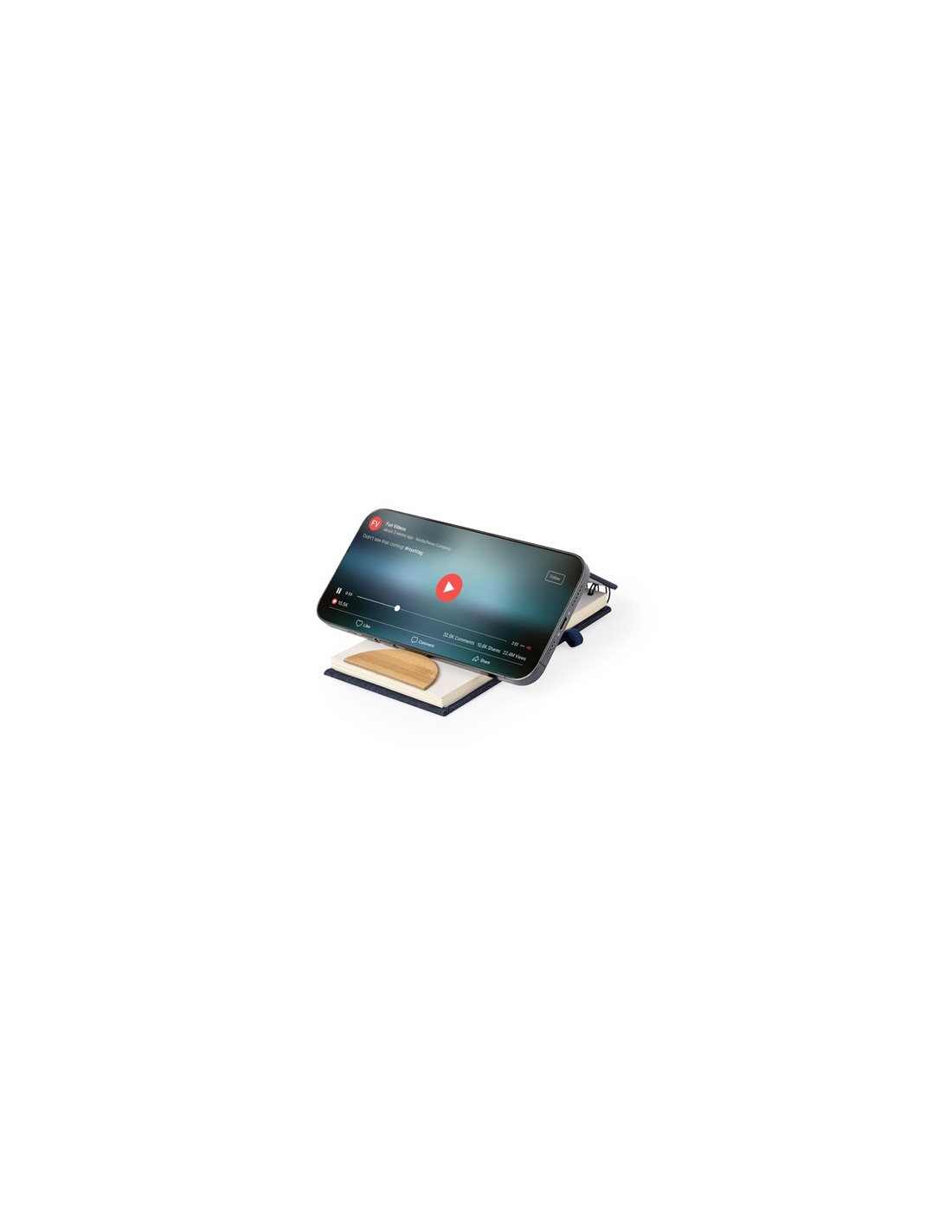Libreta de anillas con soporte elaborado en RPET 300D y bambú. Sus tapas rígidas destacan por un versátil soporte integrado para smartphone, fabricado en bambú. Además, cuenta con elástico de cierre y soporte para bolígrafo a juego. Contiene 80 hojas interiores lisas y está disponible en una variada gama de colores. Con logotipo RPET en contraportada y presentada en bolsa individual reciclada.El material RPET se elabora a partir de plástico reciclado, para así fomentar la reutilización de residuos plásticos y ayudar a la sostenibilidad del planeta. Portada Rígida. 80 Hojas Composition : Poliéster 300D RPET/ Bambú.