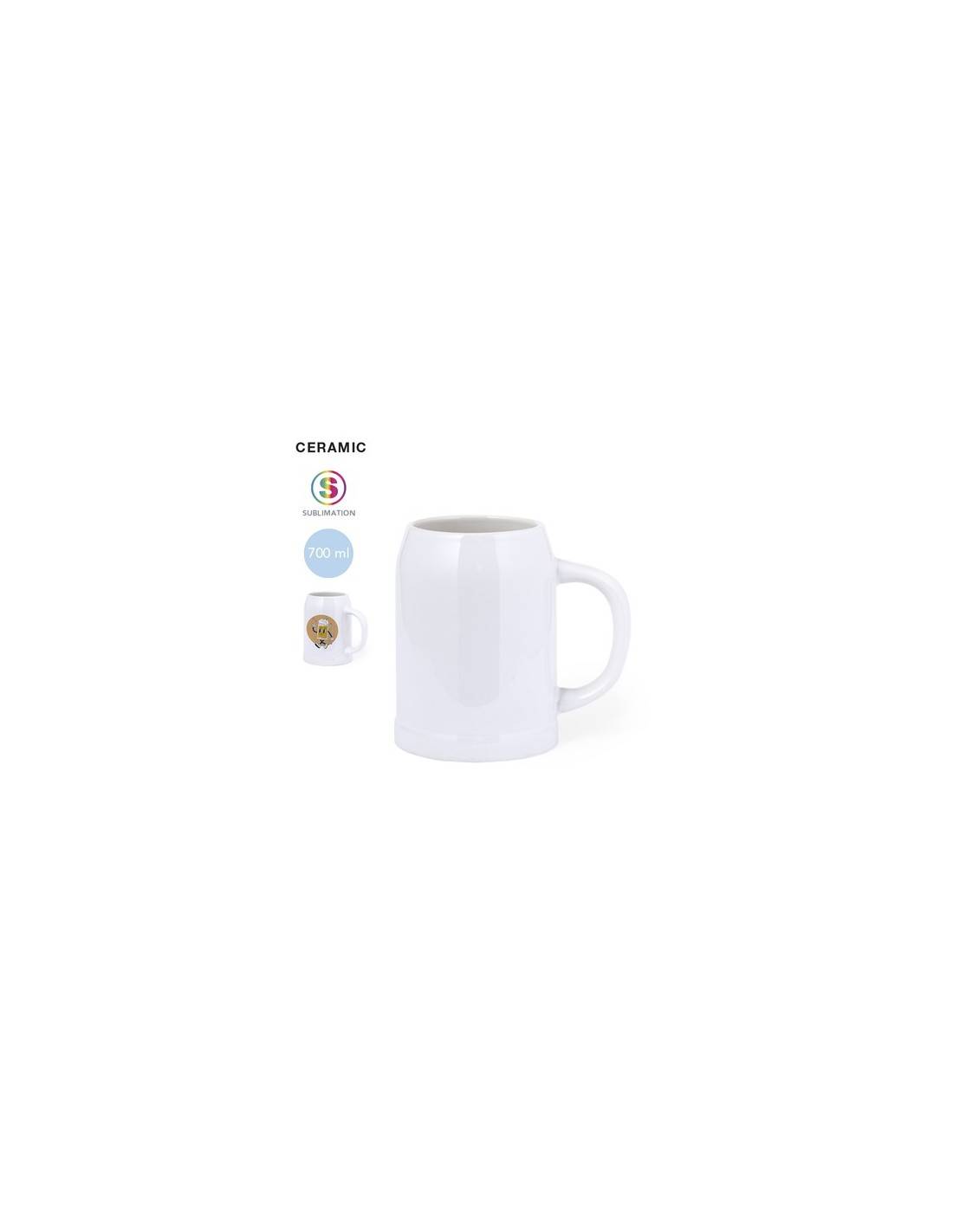 Jarra de cerámica en elegante acabado blanco para los más cerveceros, de 700 ml de capacidad y con cómoda asa. Especialmente diseñada para el marcaje en sublimación y presentada en caja individual kraft. 700 ml Composition : Cerámica.