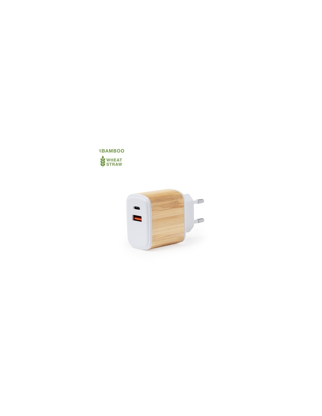 Cargador Tipo C y USB de pared con carga rápida, fabricado en combinación de bambú y caña de trigo. Enchufe europeo y presentado en atractiva caja individual de diseño kraft.Materiales como el bambú fomentan la utilización de materias primas naturales, reduciendo las emisiones contaminantes. Proviene de una planta de gran resistencia y versatilidad, con crecimiento y regeneración rápidos, siendo una excelente alternativa al uso de madera tradicional.La caña de trigo fomenta la utilización de materias primas naturales, reduciendo así las emisiones contaminantes. Carga Rápida. 1 Salida USB y 1 Salida Tipo C Composition : Caña de Trigo/ ABS/ Bambú.