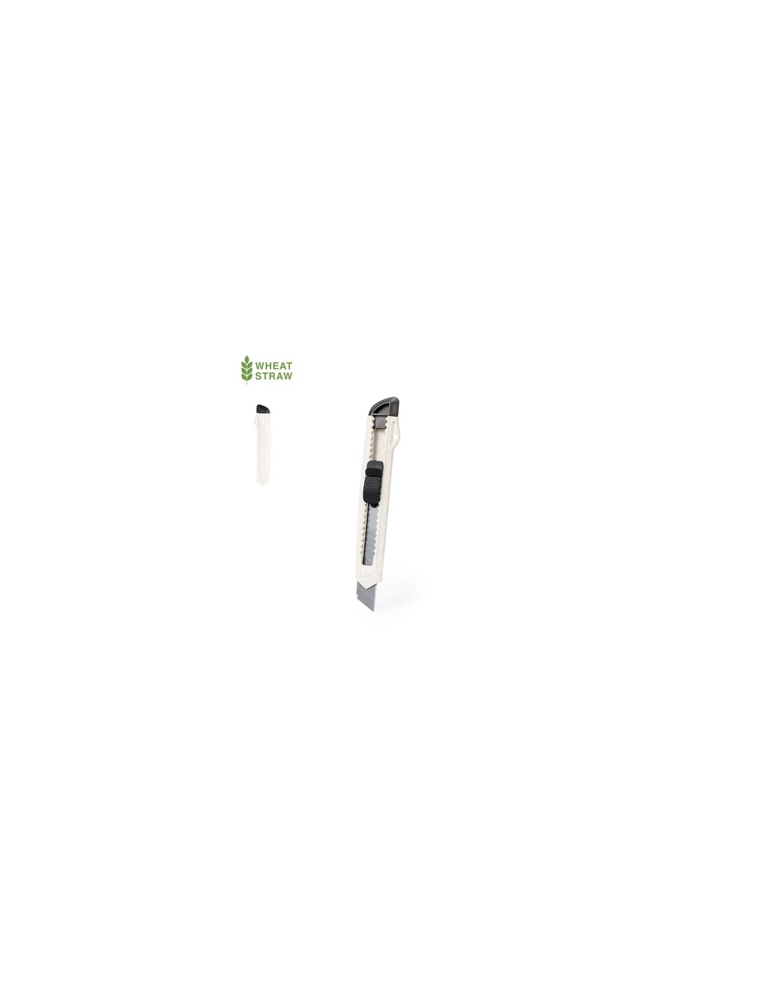 Cutter con cuchilla ancha fabricado en caña de trigo. Mango ergonómico troquelado con capucha extraíble para ajuste de corte de cuchilla, con mecanismo de bloqueo para mayor seguridad. Con logotipo caña de trigo incluido. Presentado individualmente en bolsa de papel reciclado. La caña de trigo fomenta la utilización de materias primas naturales, reduciendo así las emisiones contaminantes. Composition : Caña de Trigo/ ABS.