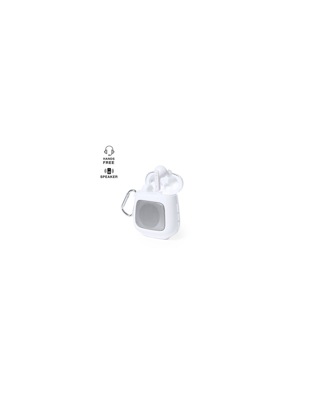 Originales auriculares altavoz con conexión Bluetooth 5.0 y fabricados resistente ABS de color blanco. El set incluye un altavoz Bluetooth de 3W de potencia, con función manos libres y mosquetón de transporte. Lo completa una pareja de auriculares intraurales con botón de control integrado y batería de 30 mAh cada uno. Base de carga de 600 mAh, con luz LED de estado de carga. Presentación en caja individual de diseño kraft, con manual de instrucciones en español e inglés.Fabricados conforme a los estándares RoHS y en cumplimiento con los siguientes requisitos de seguridad:Sistema de protección contra sobrecalentamiento.Sistema de protección contra sobrecarga.Sistema de bloqueo para evitar cortocircuitos. Conexión Bluetooth. Potencia Sonido 3W. Batería 30 mAh/ Base Carga 600 mAh