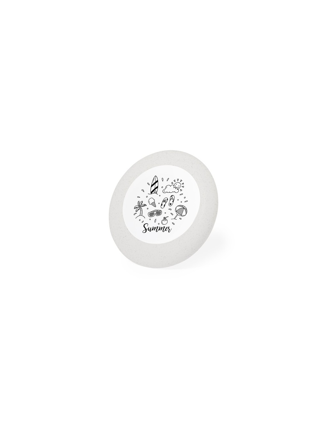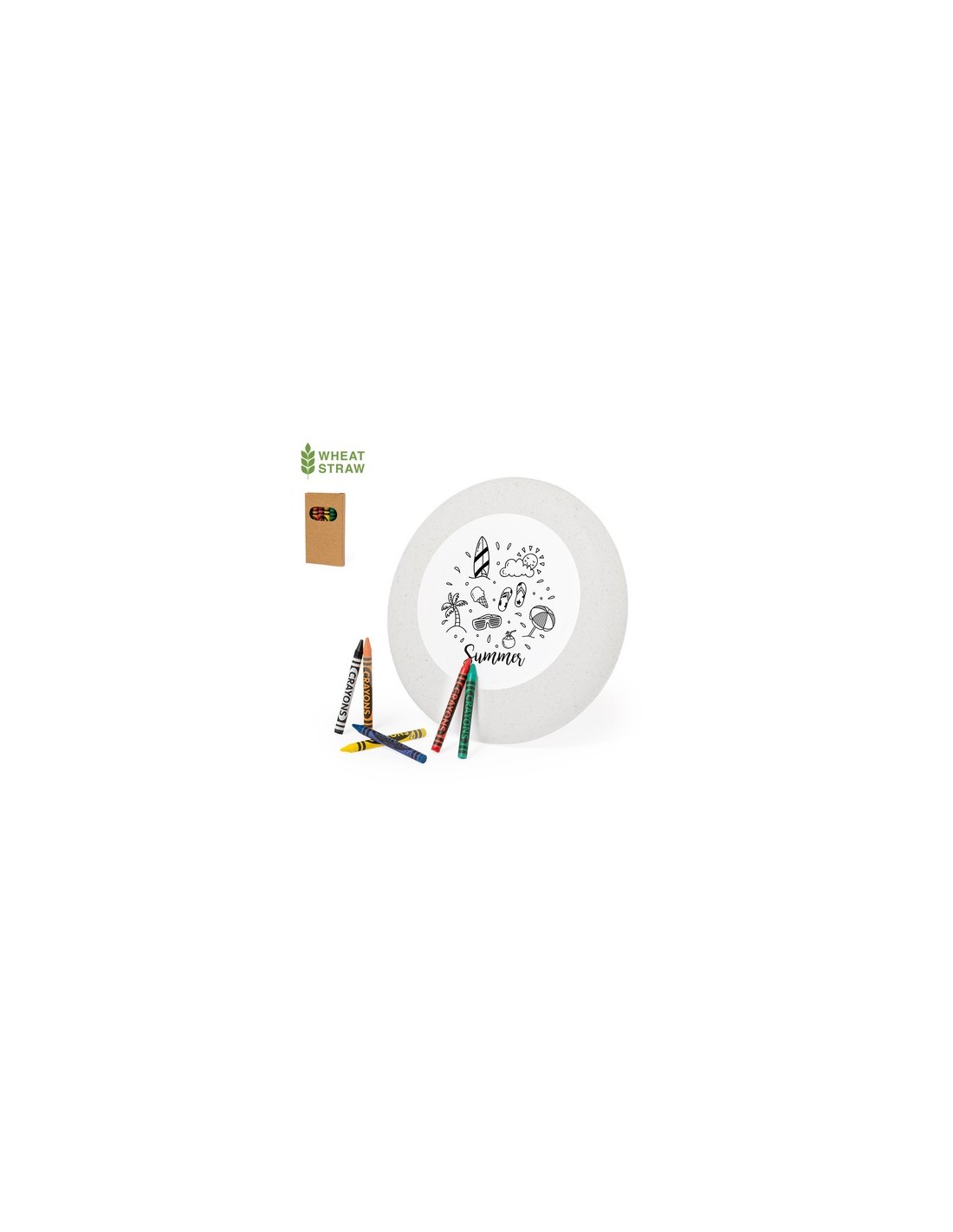 Original frisbee personalizable fabricado en caña de trigo. Divertido conjunto de ceras y frisbiee con zona para poder colorear el original dibujo de naturaleza. Presentado en bolsa de papel reciclado. Incluye:Frisbee con dibujo de naturaleza para colorear.Caja de 6 ceras en multitud de colores. 6 Ceras Incluidas Composition : Caña de Trigo/ ABS.