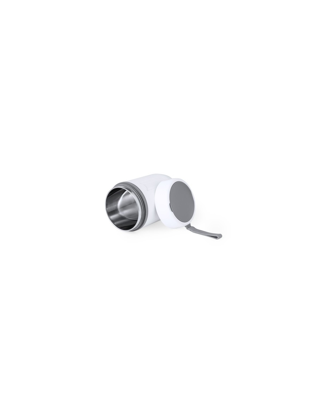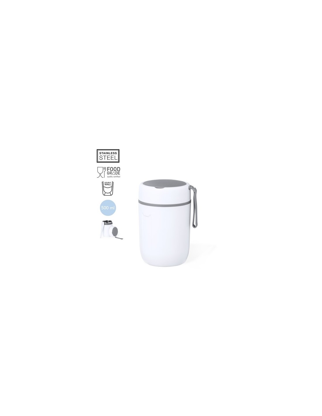 Fiambrera de doble pared, fabricada en acero inox y PP de 500 ml de capacidad. Cierre de seguridad con tapadera estanca de rosca, incluye cubierto plegable y asa de transporte. Presentada en atractiva caja individual de diseño. 500 ml Composition : PP/ Acero Inox.