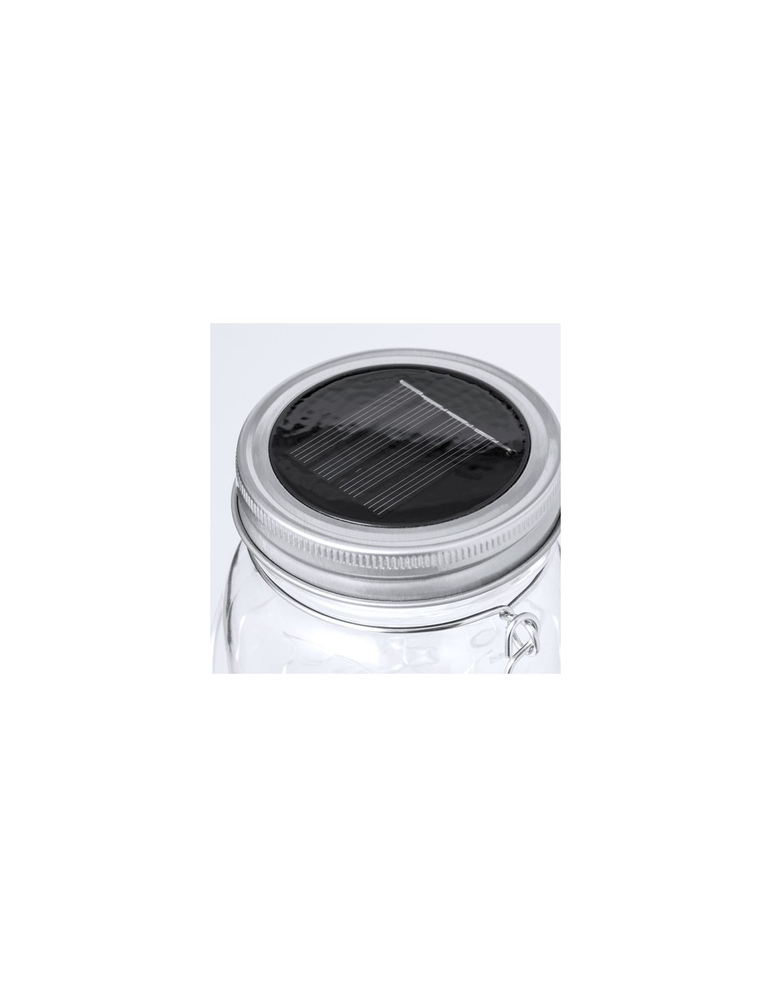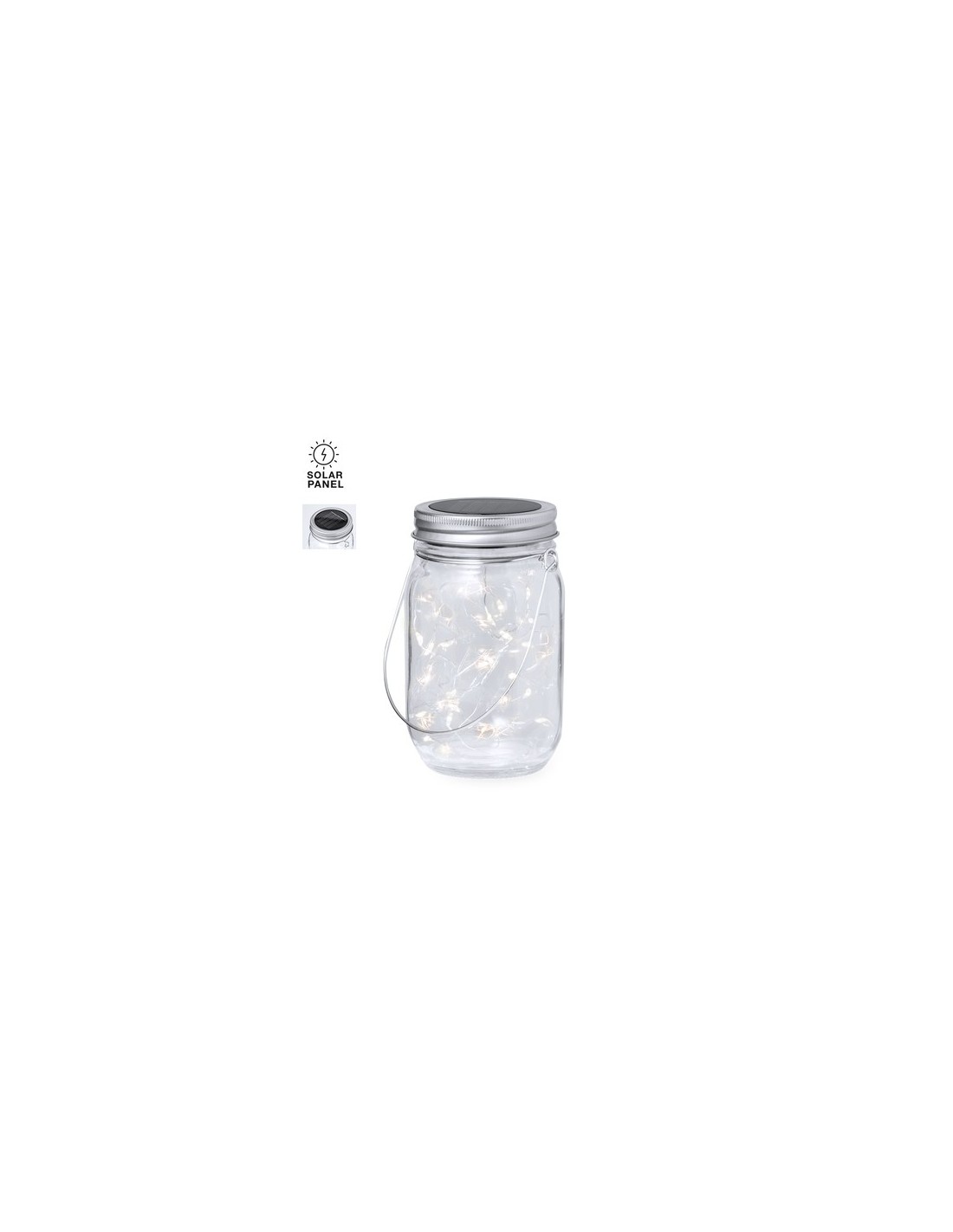 Original lámpara tarro solar, fabricada en resistente material cristal y con una tira interior decorativa de 20 LEDs. Incluye tapadera a rosca metálica con minipanel solar de recarga integrado y una batería recargable de 300 mAh. Con práctica asa para transportar o colgar, y presentada en caja individual de diseño kraft. 20 Ledes. Carga Solar. Batería 300 mAh Composition : Cristal.