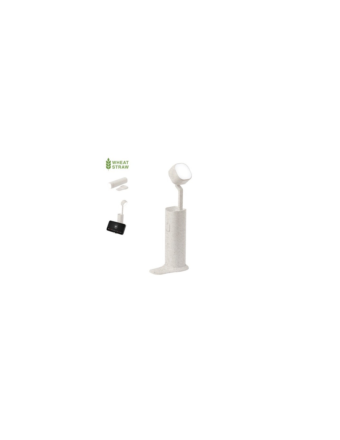 Lámpara multifunción fabricada en caña de trigo. Incluye 12 LEDs de intensidad regulable, es plegable y ajustable en altura. Incluye soporte para dispositivos móviles y tiene base antideslizante, con cable cargador Micro USB incluido. Disponible manual de instrucciones en español e inglés y presentada en caja de diseño kraft.La caña de trigo fomenta la utilización de materias primas naturales, reduciendo así las emisiones contaminantes.Fabricada conforme a los estándares RoHS y en cumplimiento con los siguientes requisitos de seguridad:Sistema de protección contra sobrecalentamiento.Sistema de protección contra sobrecarga.Sistema de bloqueo para evitar cortocircuitos. 12 Ledes. Altura Regulable. Intensidad de Luz Regulable. Batería 1200 mAh Composition : Caña de Trigo/ ABS.