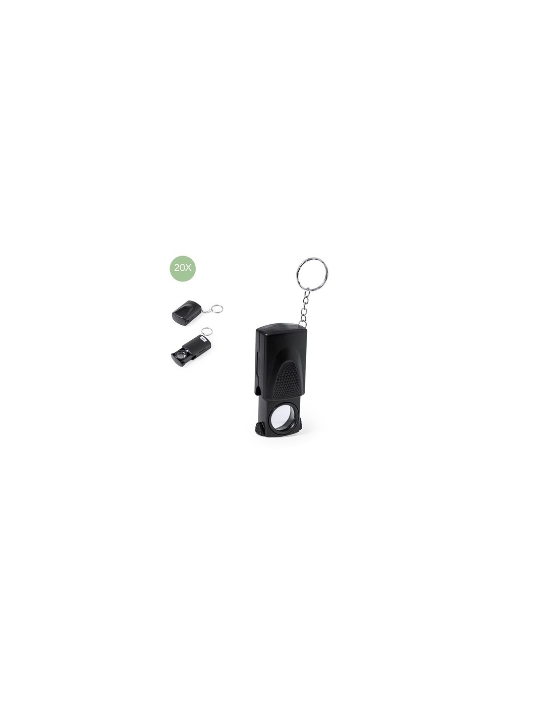 Práctica lupa llavero con aumento 20x y luz LED integrada. Fabricada en resistente ABS de color negro y fácil de transportar por su reducido tamaño. Alimentada por 1 pila de botón (incluida) y presentada en caja individual de cartón negra. 1 Led. Pilas Botón Incluidas