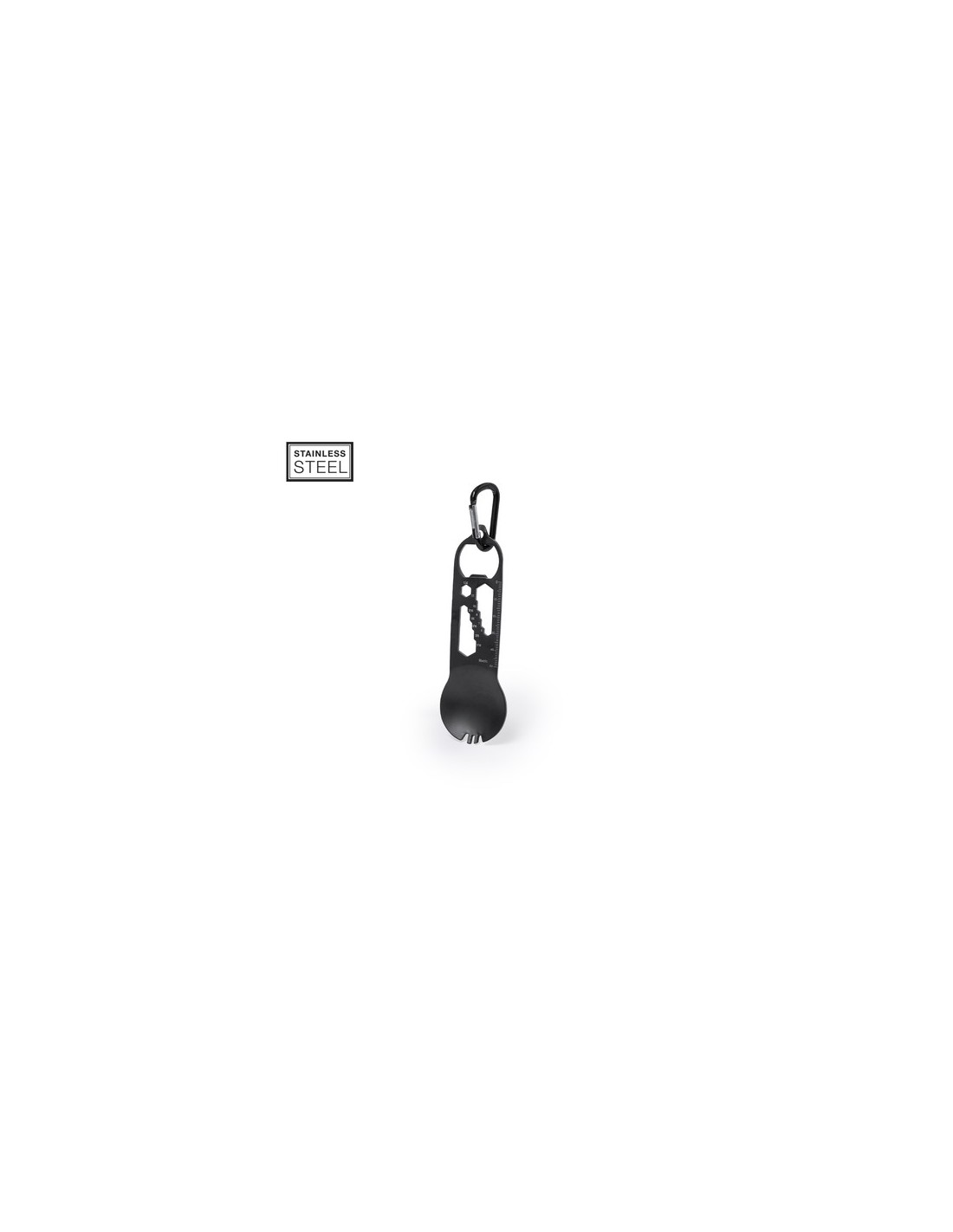 Completa multiherramienta con 16 funciones en acero inox. Incluye: mosquetón para transportarlo fácilmente, zona plana función destornillador, abrebotellas, regla de hasta 5 cm en un lateral, parte central para tuercas de 11 medidas diferentes (desde 1/4 hasta 11) y práctica cuchara con dientes para uso de tenedor. Presentada en una bolsa individual. 16 Funciones Composition : Acero Inox.