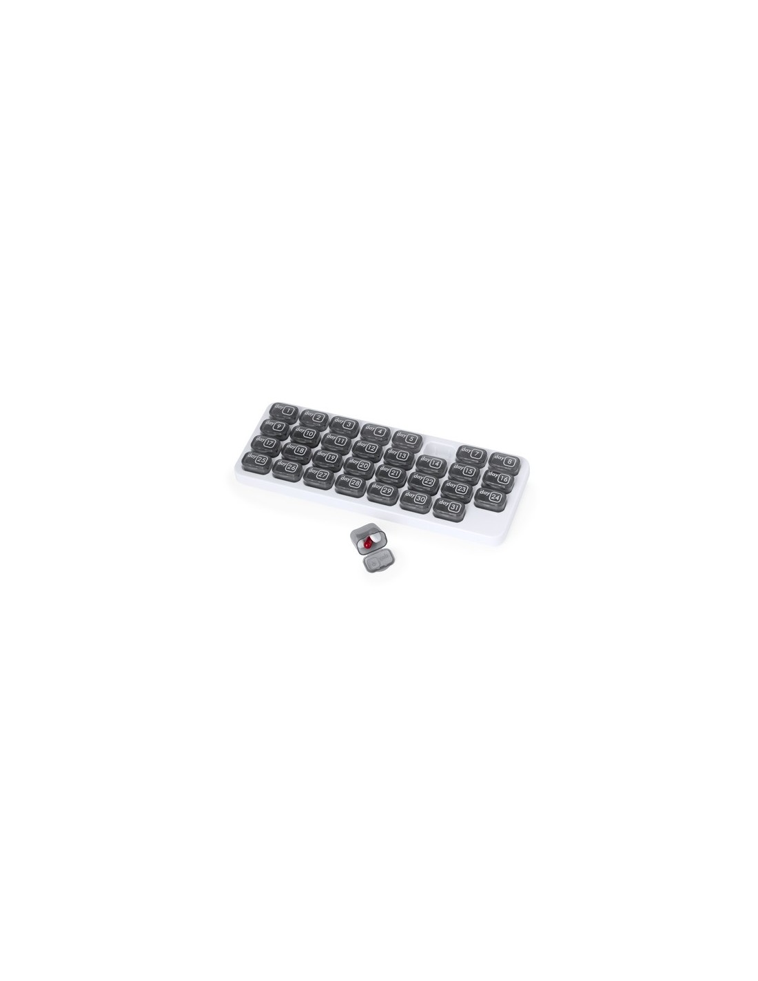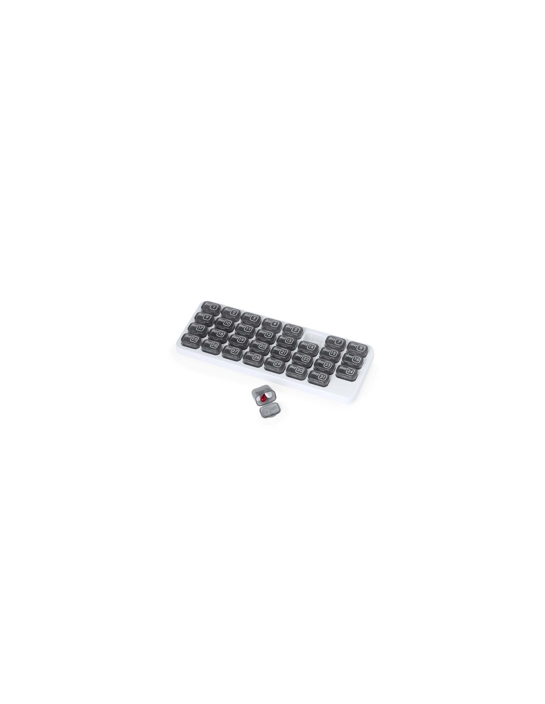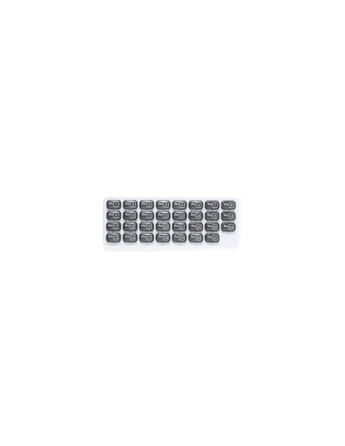 Original pastillero mensual fabricado en resistente PP. Organizador de 31 casillas independientes y extraíbles para guardar día a día todos los comprimidos necesarios. Elegante base blanca y casillas de color gris con el día del mes marcado. Presentado en bolsa individual. 31 Compartimentos