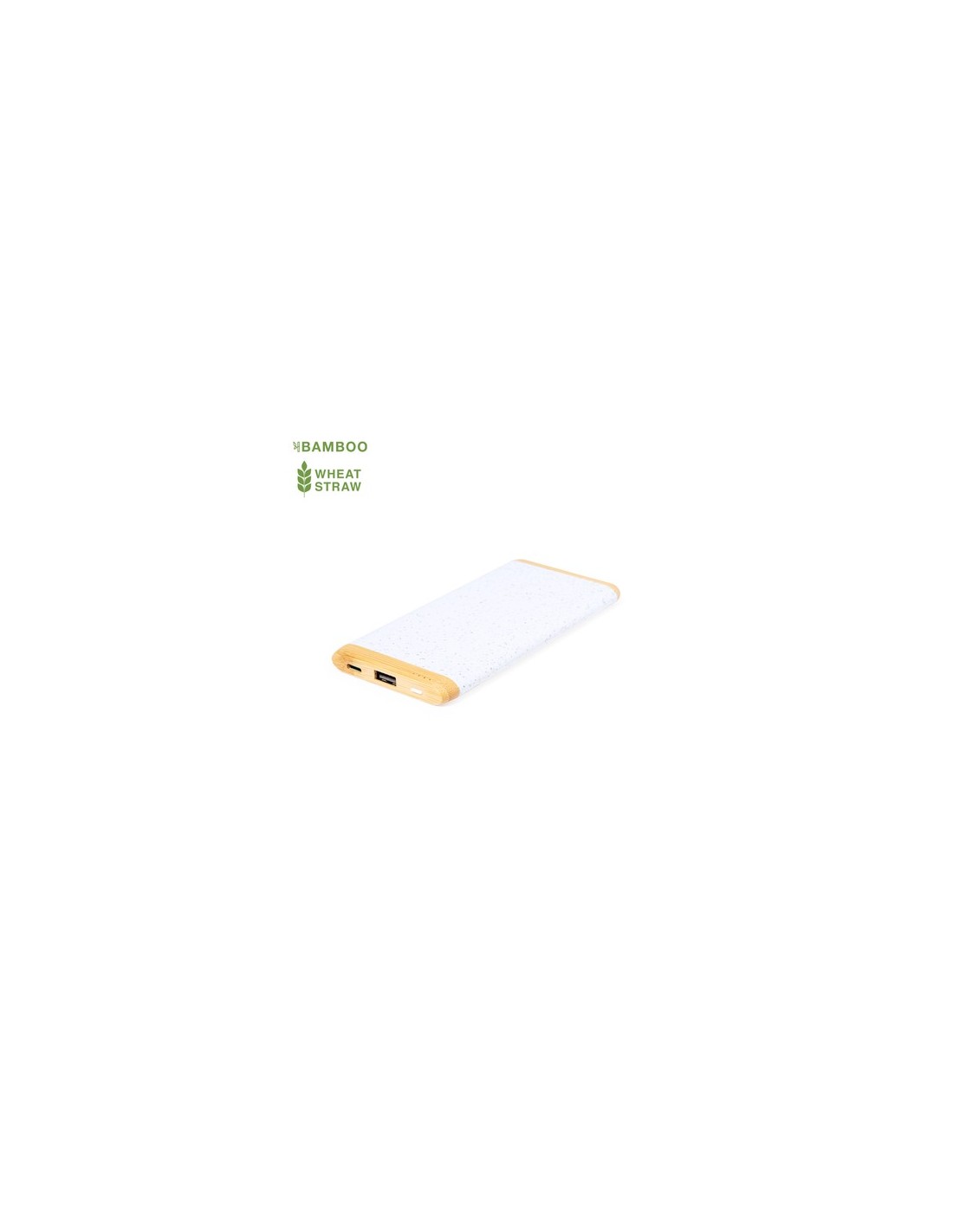Batería auxiliar externa fabricada en combinación de bambú y caña de trigo. De 5.000 mAh de capacidad de carga y conexiones de entrada/salida Tipo C + salida USB. Con botón e indicador LED de estado de carga, y presentada en caja individual de diseño eco en cartón kraft.Materiales como el bambú fomentan la utilización de materias primas naturales, reduciendo las emisiones contaminantes. Proviene de una planta de gran resistencia y versatilidad, con crecimiento y regeneración rápidos, siendo una excelente alternativa al uso de madera tradicional.La caña de trigo fomenta la utilización de materias primas naturales, reduciendo así las emisiones contaminantes.Las capacidades mostradas en todas nuestras baterías auxiliares externas son reales, incorporando todas ellas baterías de grado A y no recicladas, con una vida útil de al menos 500 ciclos de carga y según normativa CE. Además, están fabricadas conforme a los estándares RoHS y en cumplimiento con los siguientes requisitos de seguridad:Sistema de protección contra sobrecarga del power bank.Sistema de protección contra descarga completa que proporciona una mayor durabilidad del power bank.Sistema de bloqueo para evitar cortocircuitos.Sistema de transferencia de carga constante, acorde con la capacidad del dispositivo de destino. 5000 mAh. Salida USB. Salida y Entrada Tipo C Composition : Caña de Trigo/ ABS/ Bambú.