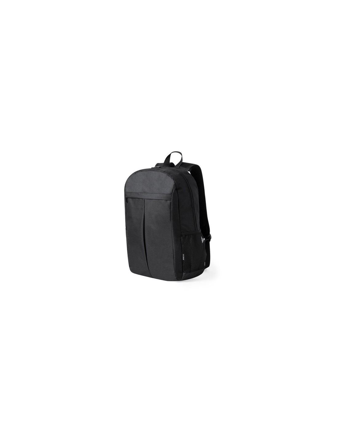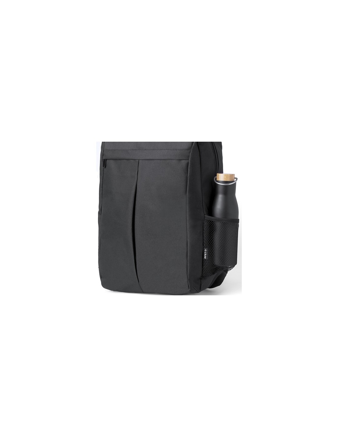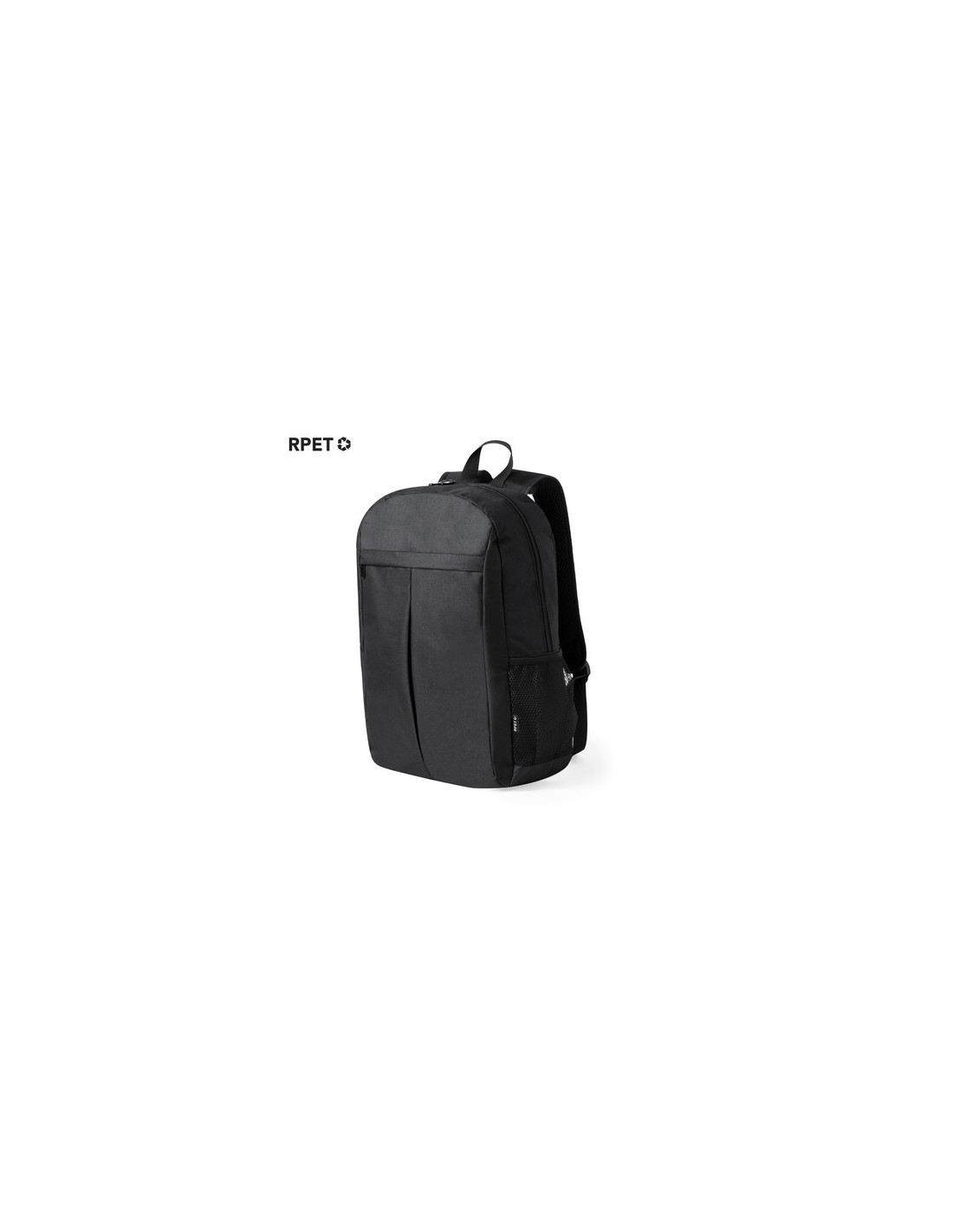 Mochila elaborada en resistente 600D RPET. Provista de cierre de cremallera de doble tirador y un práctico bolsillo frontal. Su interior cuenta con compartimentos acolchados diseñados para tablet de hasta 10 pulgadas y portátil de hasta 15 pulgadas. La espalda y las cintas de hombros están acolchadas y son ajustables, incorporando un tejido especial transpirable. Además, presenta una cinta superior y bolsillos laterales de rejilla. Logotipo RPET en etiqueta. Presentada en una bolsa individual reciclada. El material RPET se elabora a partir de plástico reciclado, para así fomentar la reutilización de residuos plásticos y ayudar a la sostenibilidad del planeta. Bolsillo Acolchado para Portátil y Tablet. Parte Trasera y Cintas Acolchadas Composition : Poliéster 600D RPET.