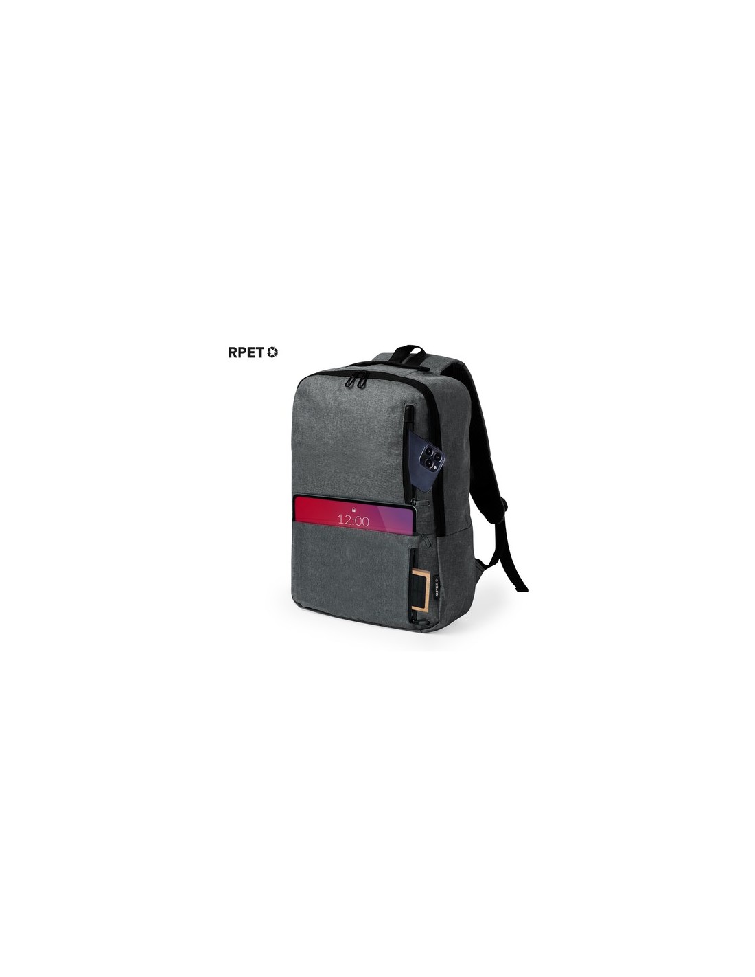 Mochila elaborada en resistente 600D RPET. Equipada con un cierre de cremallera de doble tirador y tres bolsillos frontales de acceso rápido. En su interior, cuenta con compartimentos acolchados diseñados para tablet de hasta 10 pulgadas y portátil de hasta 15 pulgadas. Las cintas de hombros son acolchadas y ajustables para brindar comodidad. Además, presenta una cinta superior y bolsillo lateral para mayor funcionalidad. Disponible en tres elegantes colores, con cremalleras negras. Logotipo RPET en etiqueta. Presentada en una bolsa individual reciclada. El material RPET se elabora a partir de plástico reciclado, para así fomentar la reutilización de residuos plásticos y ayudar a la sostenibilidad del planeta. Bolsillo Acolchado para Portátil y Tablet. Parte Trasera y Cintas Acolchadas Composition : Poliéster 600D RPET.