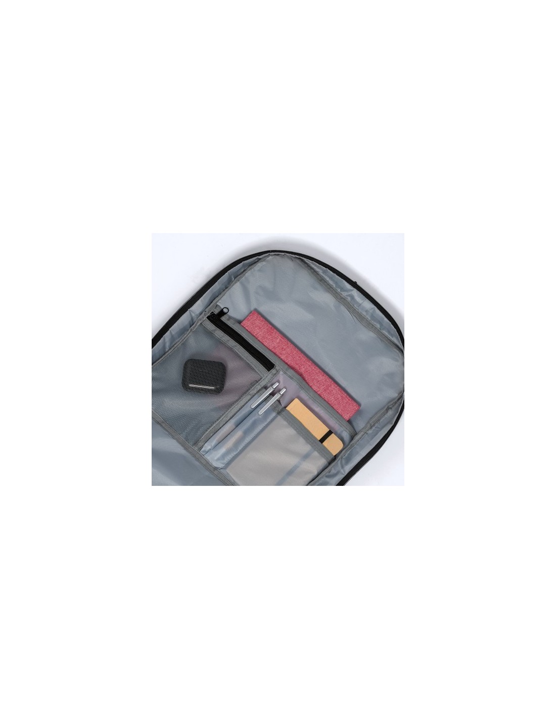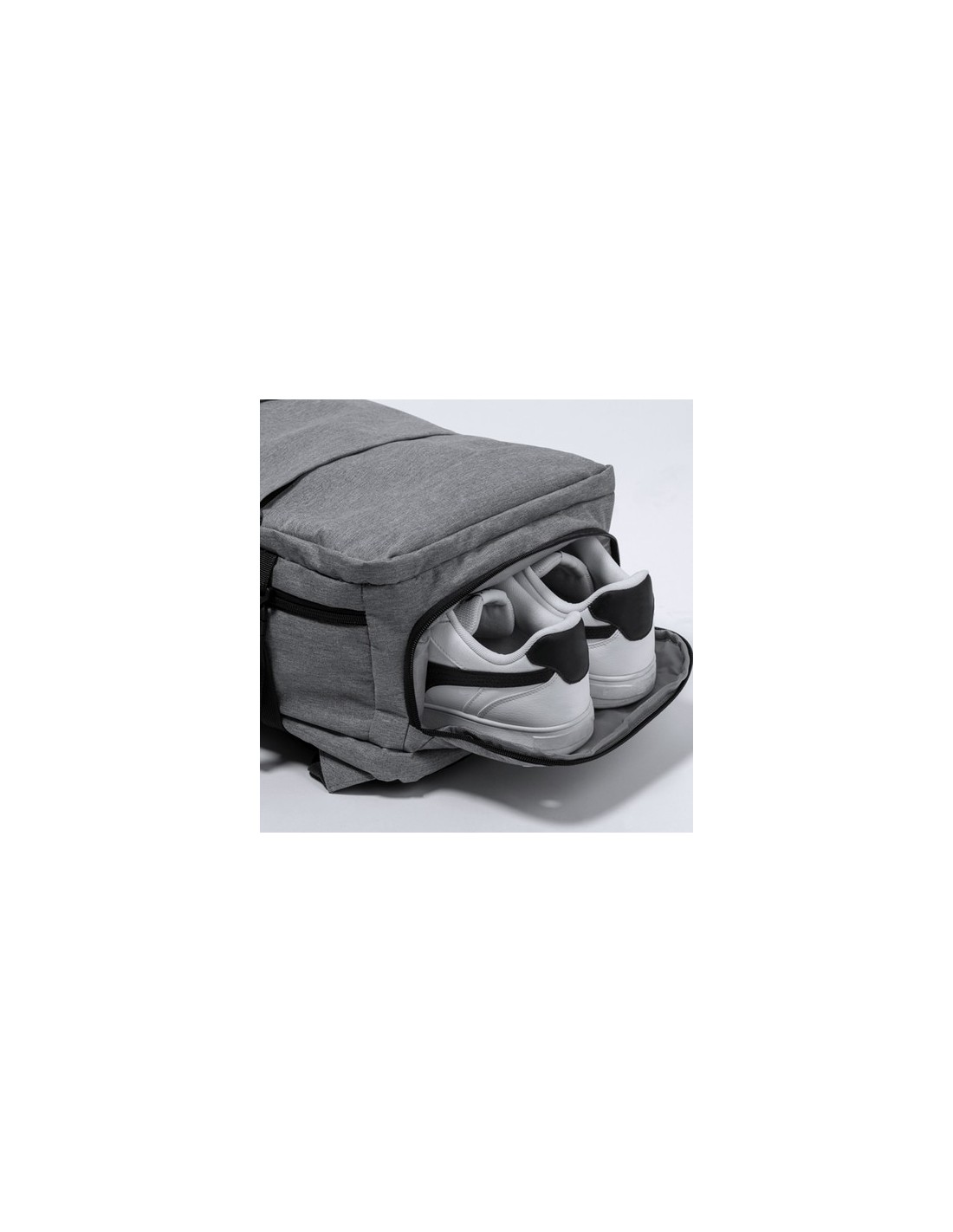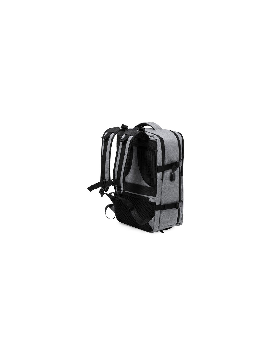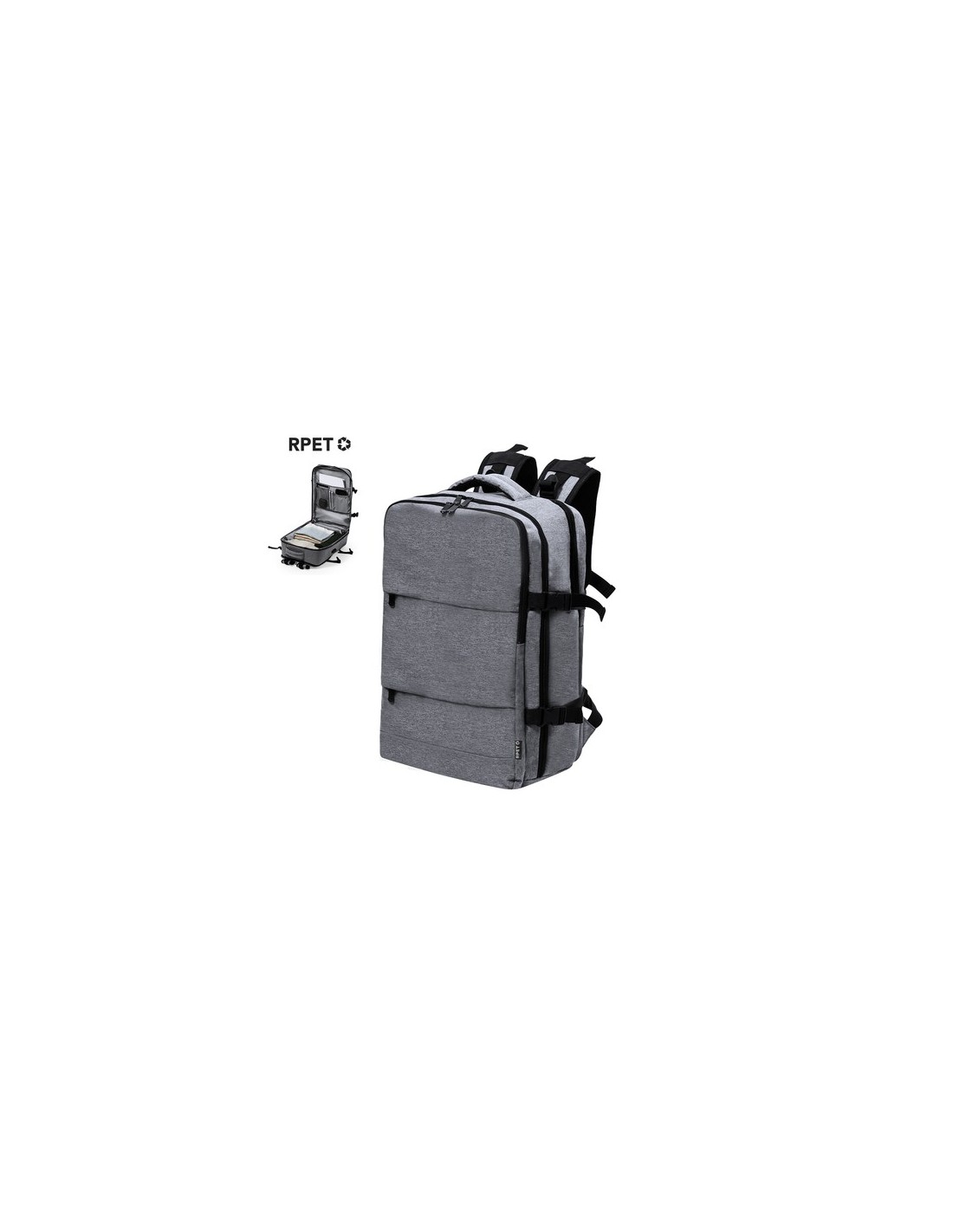 Mochila multifunción fabricada en 300D RPET. Elaborada con poliéster reciclado y resistente al agua, cuenta con una excelente transpirabilidad en la zona trasera, facilitando la disipación del calor gracias a sus cintas y respaldo acolchados. Las cintas anchas están diseñadas para aliviar la presión en los hombros, permitiendo llevar la mochila cómodamente durante largos periodos.Perfecta para cualquier situación por tener múltiples compartimentos: 2 bolsillos frontales. 3 compartimentos grandes centrales, uno de ellos portatodo, un bolsillo central de gran capacidad para guardad ropa y/o complementos con organizador en su interior, y un tercero acolchado, perfecto para llevar portátil de hasta 17,3 pulgadas. Además, cuenta con 3 apartados especiales, un bolsillo lateral perfecto para tener acceso rápido, bolsillo para calzado en la base con argollas de ventilación, y bolsillo antirrobo en la espalda, además de cable USB. Perfecta para viajes o para el día a día por sus cintas ajustables, adaptándose a todo estilo de vida. Disponible en negro y gris, con logotipo RPET incluido. Presentada individualmente en bolsa reciclada.El material RPET se elabora a partir de plástico reciclado, para así fomentar la reutilización de residuos plásticos y ayudar a la sostenibilidad del planeta. Conexión USB. Acolchada. Bolsillo Acolchado para Portátil. Compartimento Portazapatos Composition : Poliéster 300D RPET.