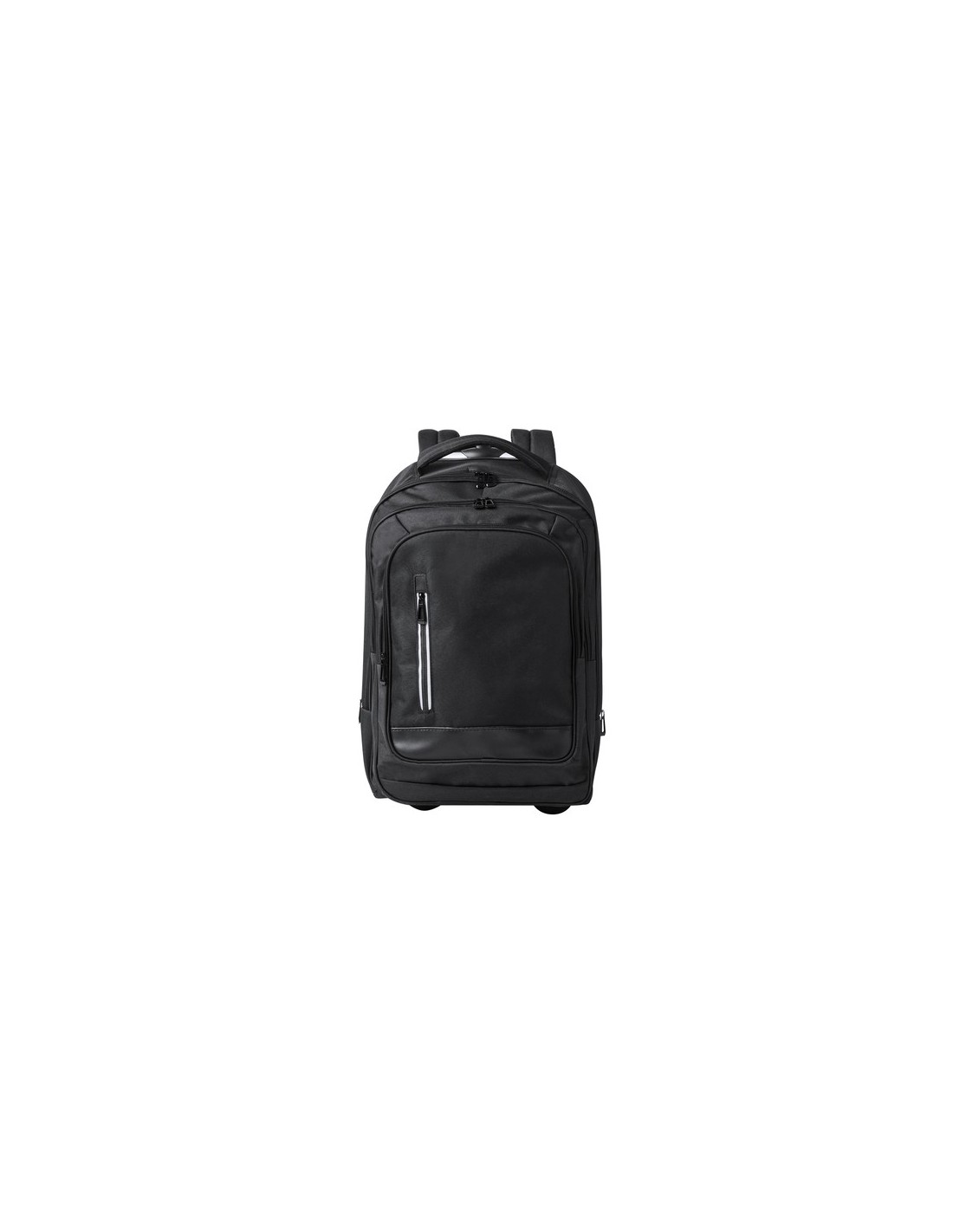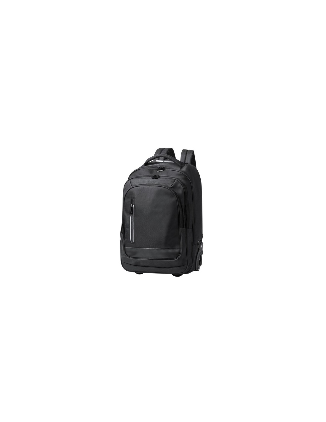 Mochila trolley de 2 ruedas en poliéster 300D de alta calidad. Incluye compartimento interior acolchado para ordenador portátil de hasta 15 pulgadas. Con asa exterior reforzada a juego y prácticos bolsillos en parte frontal. Con cremalleras a juego, además incluye cintas para hombro acolchadas y ocultas en parte posterior para usar como mochila. Presentado en bolsa individual reciclada. Bolsillo Acolchado para Portátil. Parte Trasera y Cintas Acolchadas Composition : Poliéster 300D.