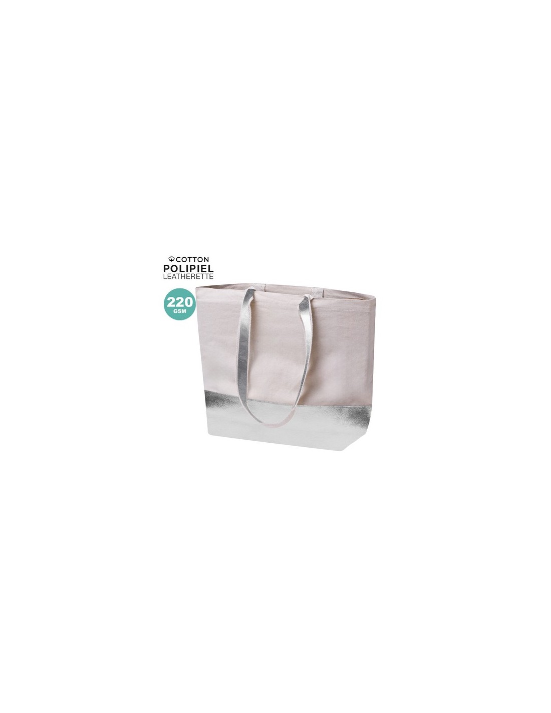 Bolsa en material 100% algodón reciclado de 220 g/m2 en combinación con polipiel metalizada. Con fuelle y asas largas de 70cm, disponibles en dorado, plateado y oro rosa, con base a juego. Resistencia hasta 8 kg de peso. Composition : Algodón/ Polipiel.
