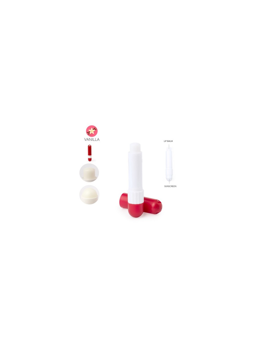 Set de bálsamo labial y protector solar. Práctico complemento con doble función y cómodo de transportar por su tamaño. Un extremo con bálsamo labial SPF15 y el otro extremo con protector solar SPF30 de agradable aroma a vainilla. Dermatológicamente testado y disponible en variada gama de colores. Presentado individualmente en una bolsa reciclada. Protección Solar SPF30. Bálsamo Labial SPF15. Aroma Vainilla